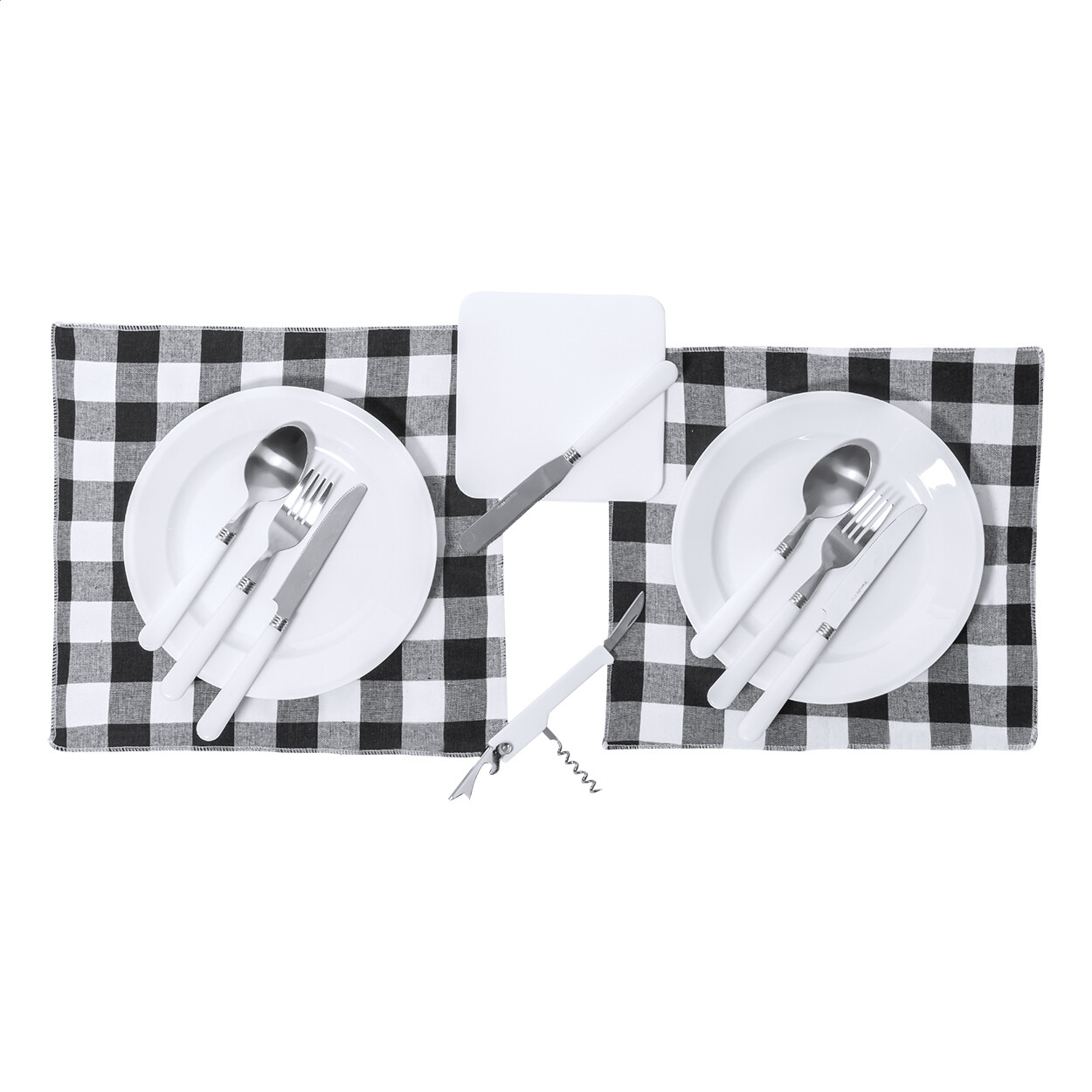 Set de vaisselle et couverts pique-nique 13 pièces pour 2 personnes, livré dans sa mallette de transport zippée en polyester RPET 600D.