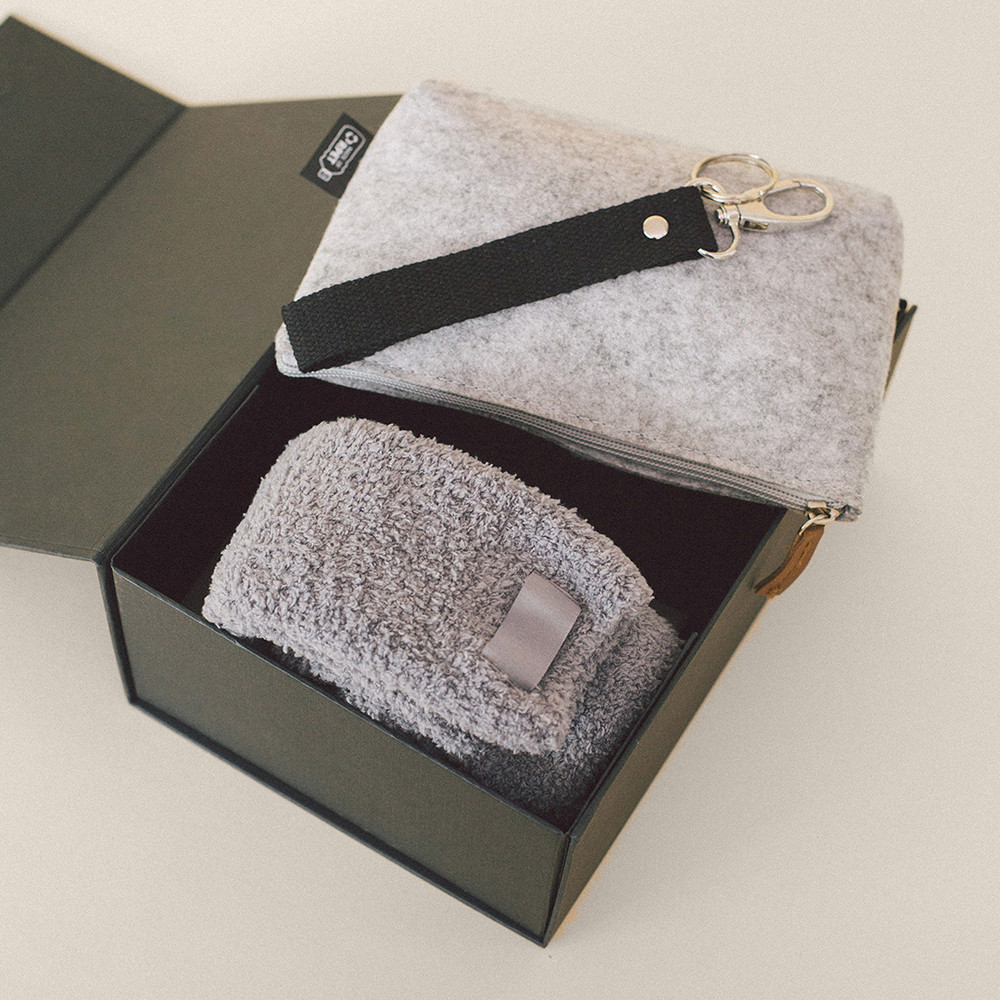 Ensemble pour la maison comprenant : trousse de toilette, chaussettes et porte-clés. Présenté dans une boîte en carton personnalisable.