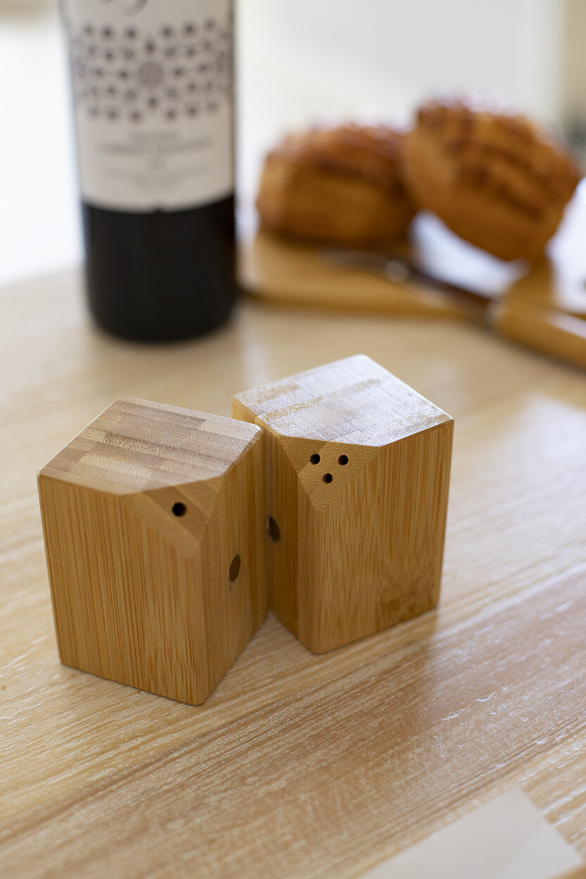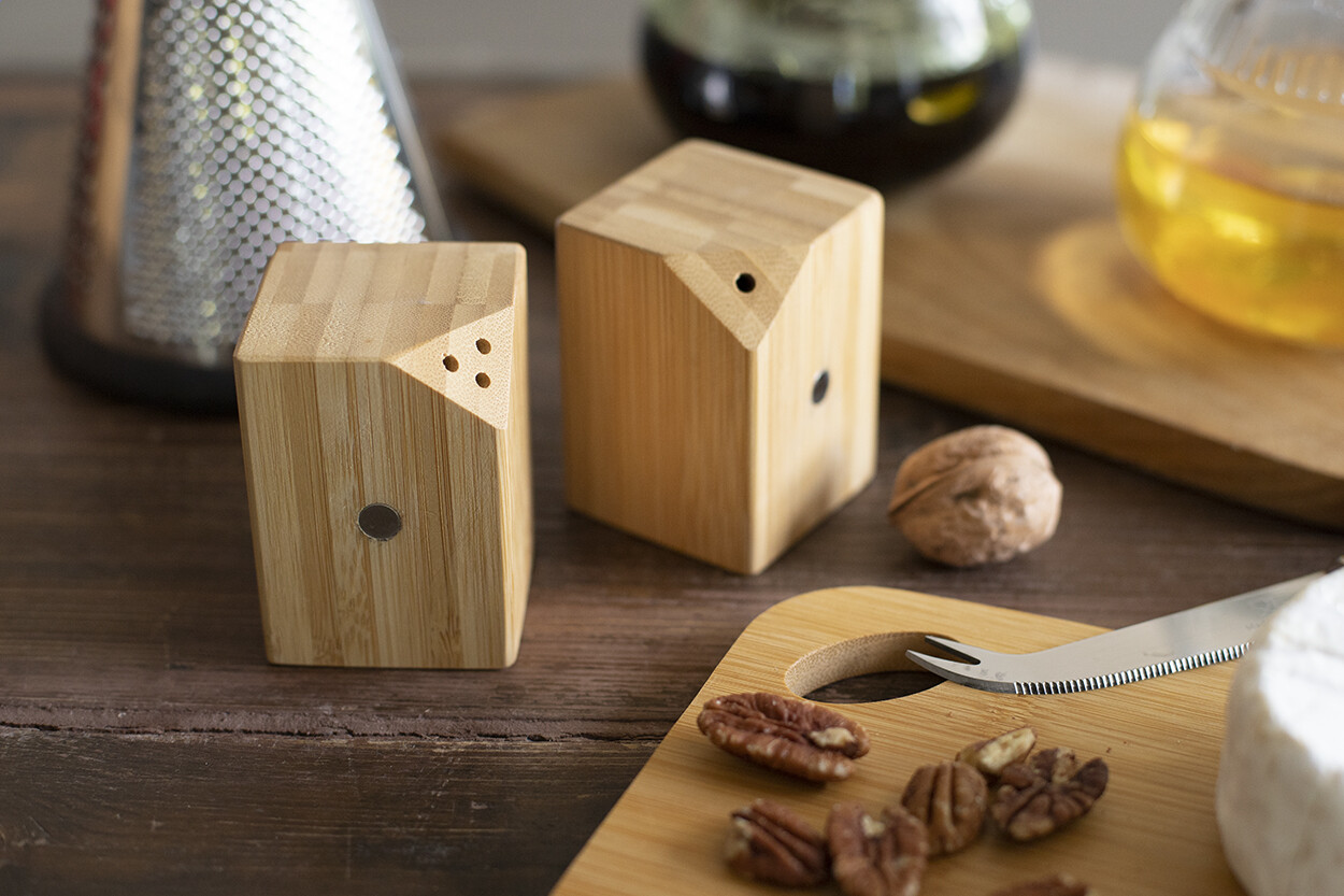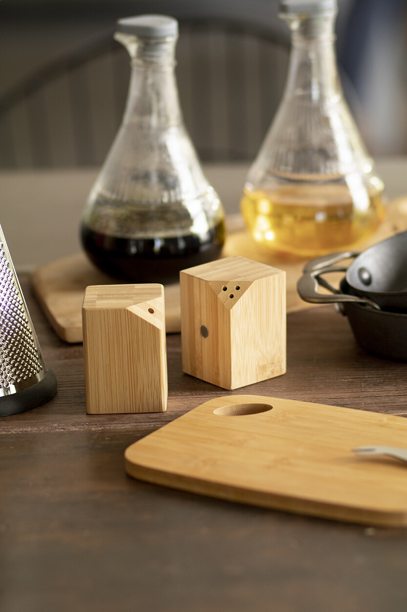 Ensemble salière et poivrière en bambou de 2 pièces. L'ensemble se ferme facilement au centre grâce à des aimants placés sur le côté des salières.