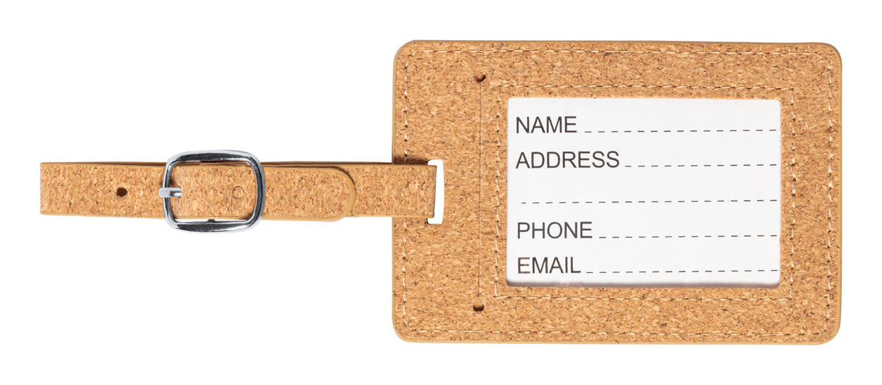 Étiquette à bagage en liège naturel avec boucle en métal.