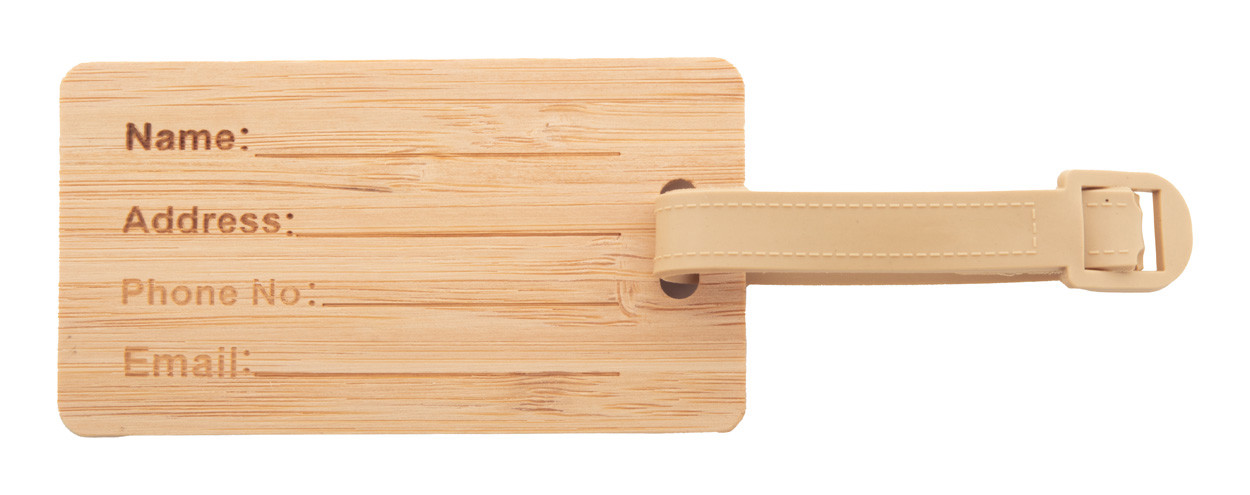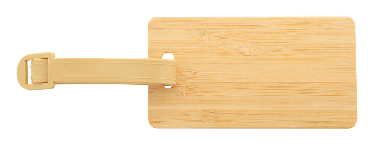 Étiquette à bagage en bambou avec sangle et boucle en plastique.