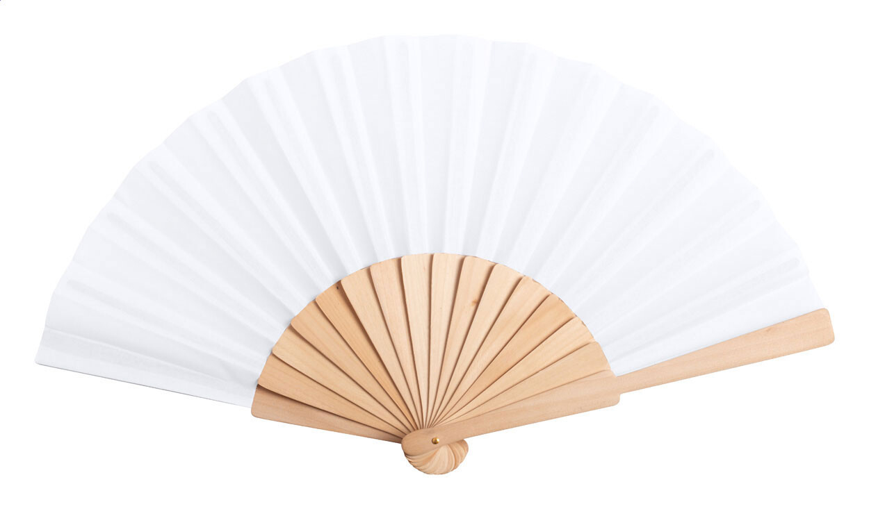 Éventail en polyester RPET. Livré dans sa boîte en papier kraft.