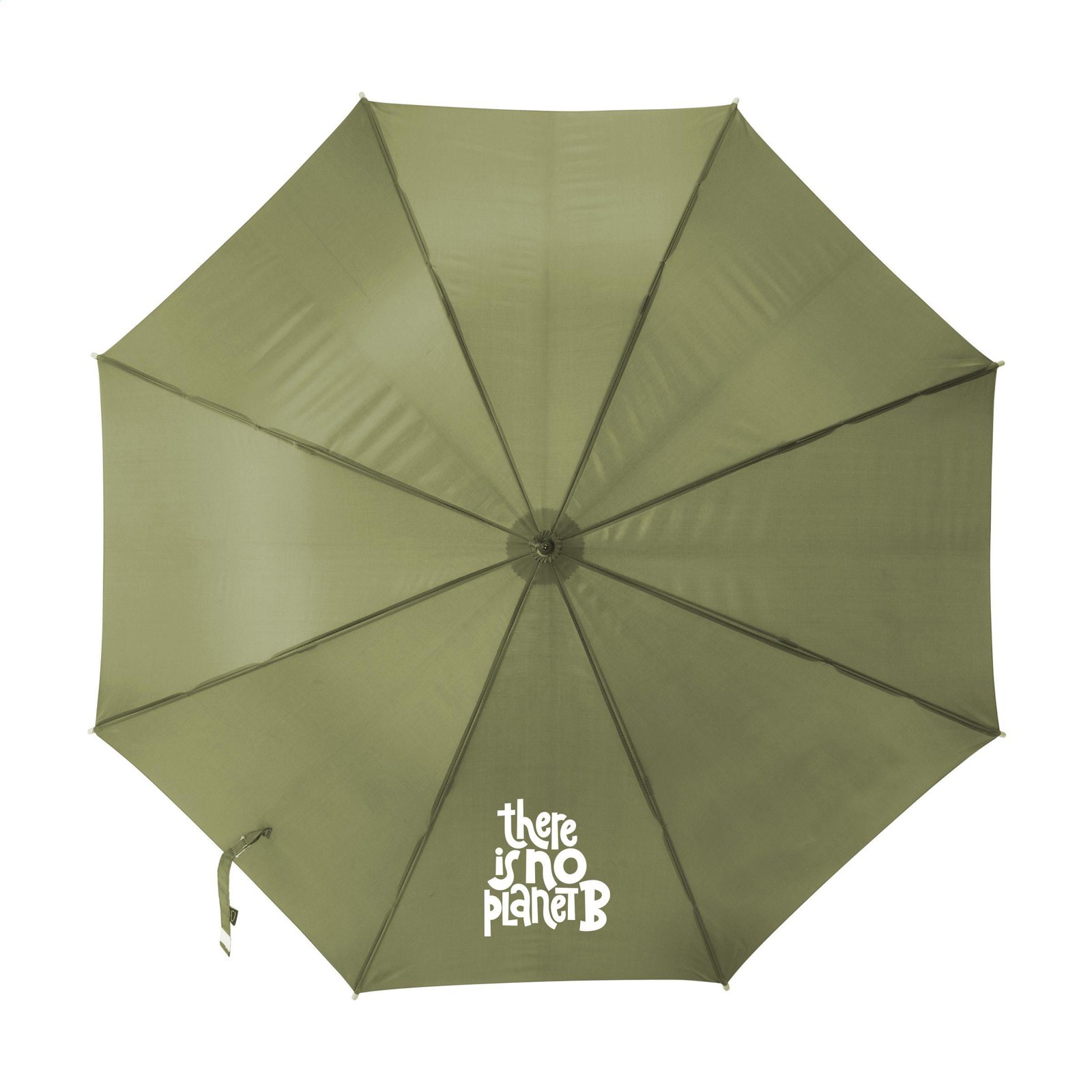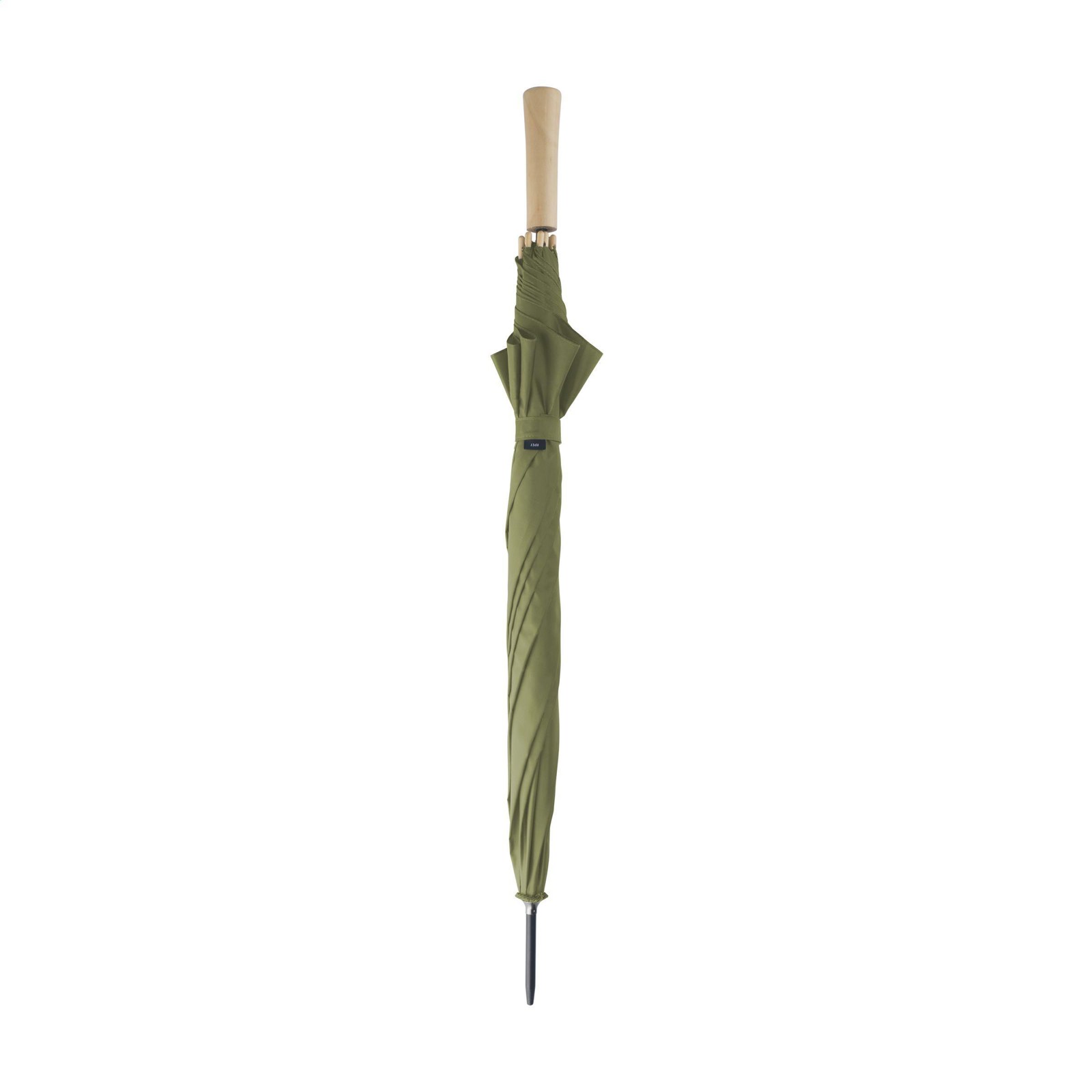 Parapluie avec une toile en polyester pongé RPET 190T. Ce parapluie dispose d'une tige en métal, d'un cadre en fibre de verre, d'une poignée en bois et une fermeture Velcro. Certifiée-RCS. Matière recyclée totale : 16%.