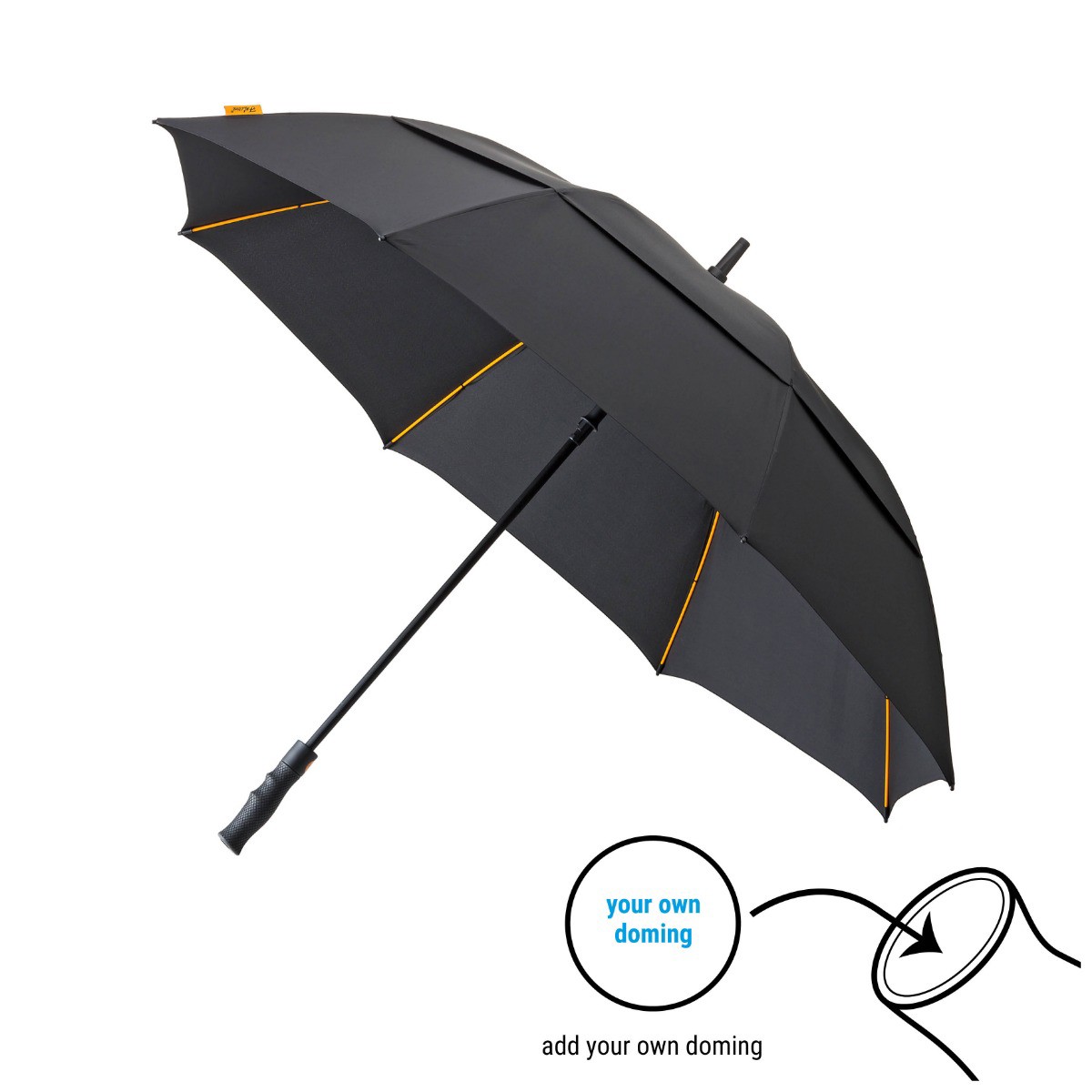GP-76 Falcone® parapluie de golf de haute qualité, automatique. Armature de haute qualité résistent au vent en fibre de verre orange. 210T polyester pongee couverture, spécialement conçu pour le vent à passer et à arrêter la pluie. Poignée finition caoutchouc noir, avec une découpe en bas pour ajouter vos propres doming et avec une housse.