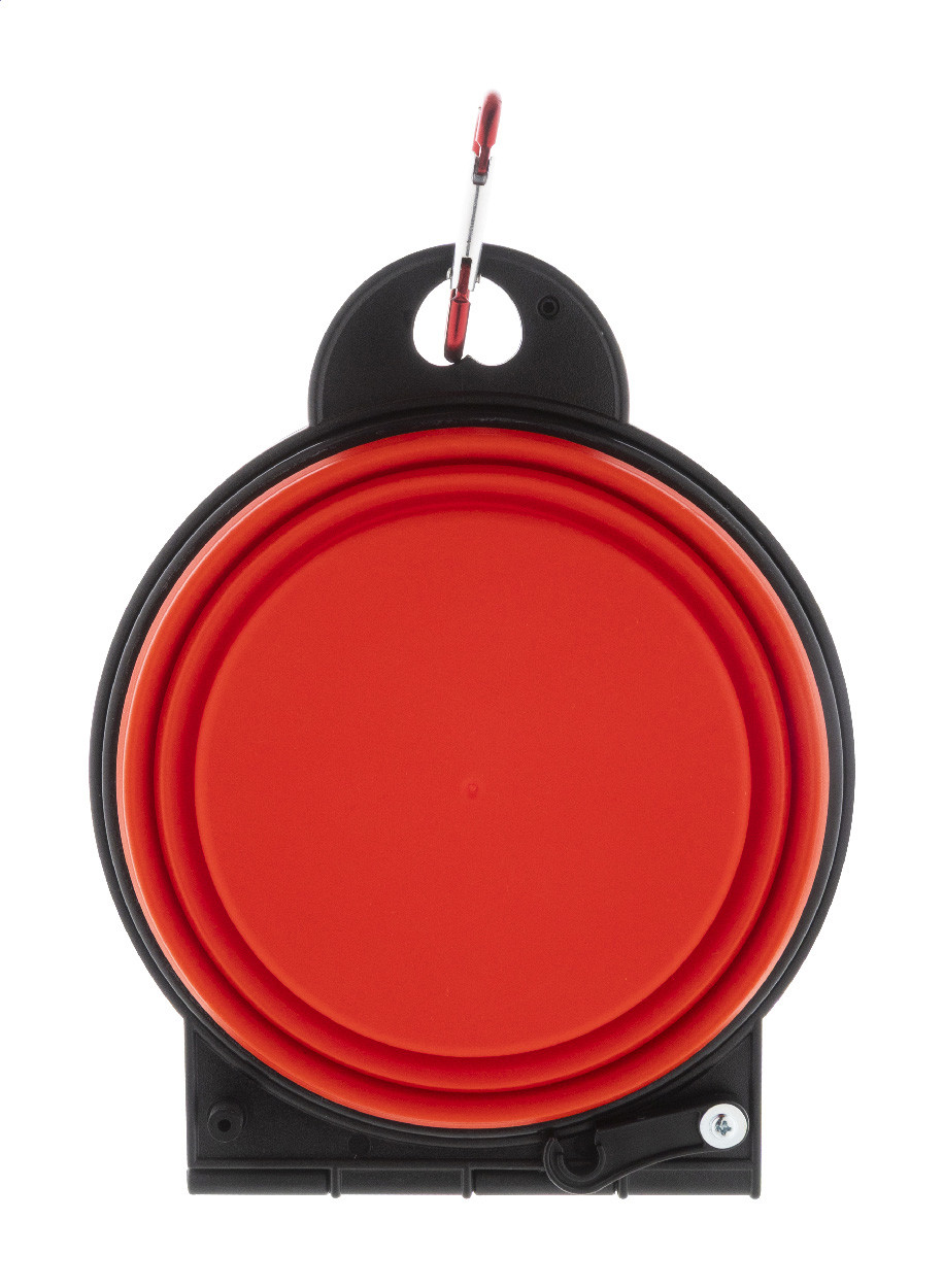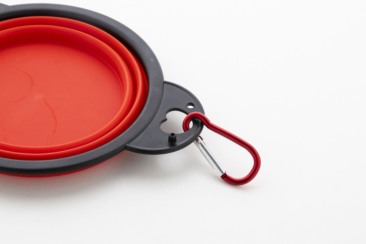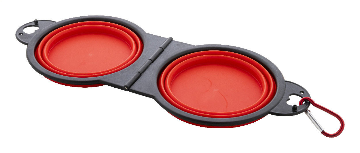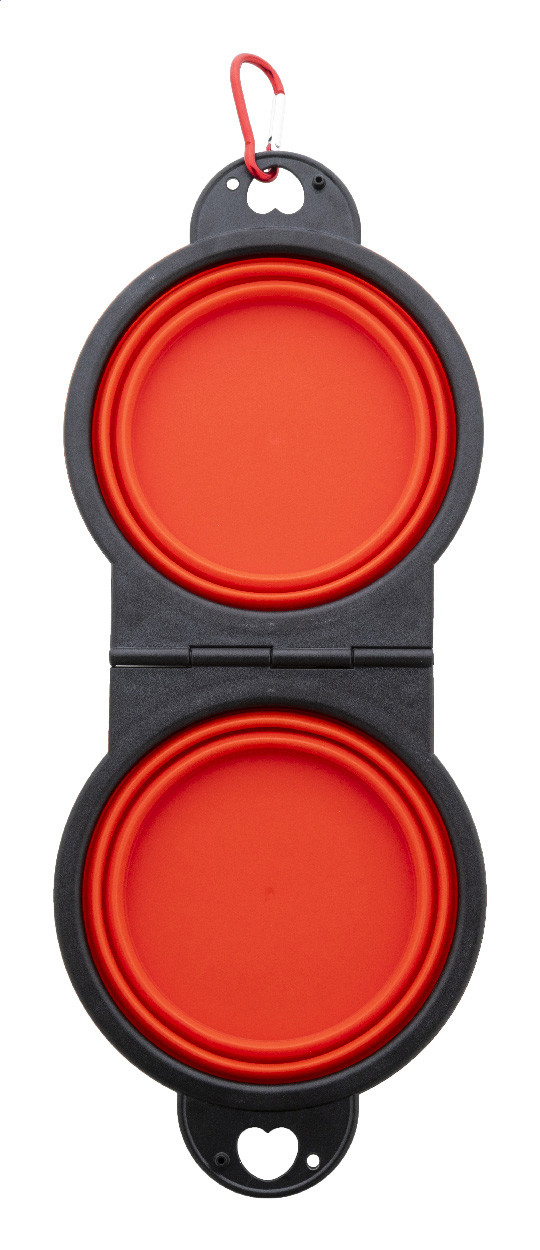 Gamelle pliable en TPE durable avec deux compartiments de 450 ml et mousqueton en aluminium de couleur assortie.