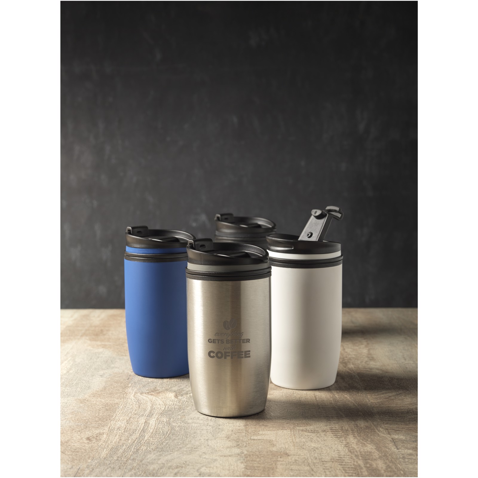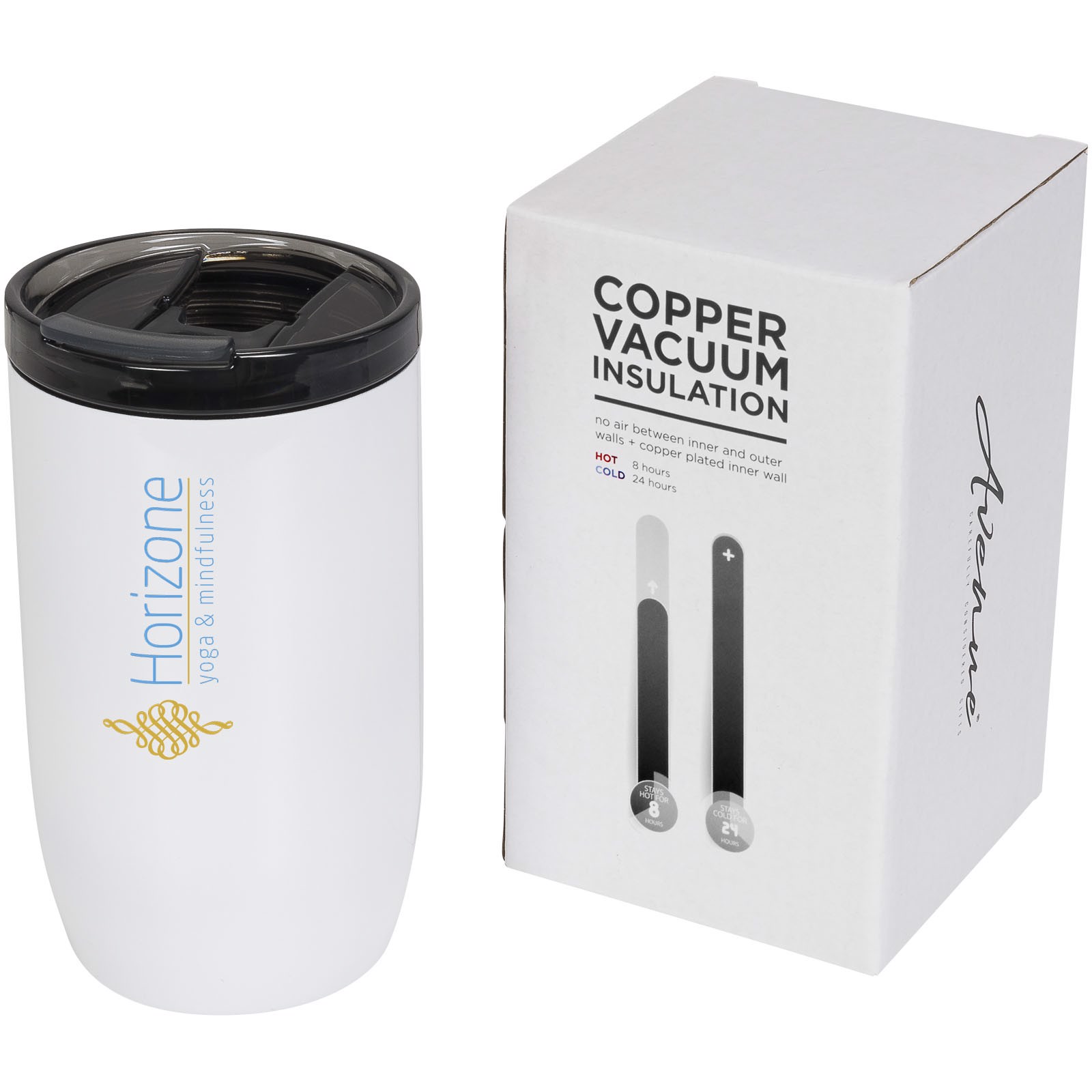 Ce gobelet compact durable est idéal pour les voyages. Le couvercle est étanche, avec ouverture facile par pression. Le gobelet est en acier inoxydable à double paroi avec isolation en cuivre, ce qui signifie qu’il maintiendra les boissons chaudes pendant 8 heures et froides pendant 24 heures. La construction empêche également la condensation à l’extérieur du gobelet. Capacité 380 ml. Présentation dans un coffret cadeau Avenue.