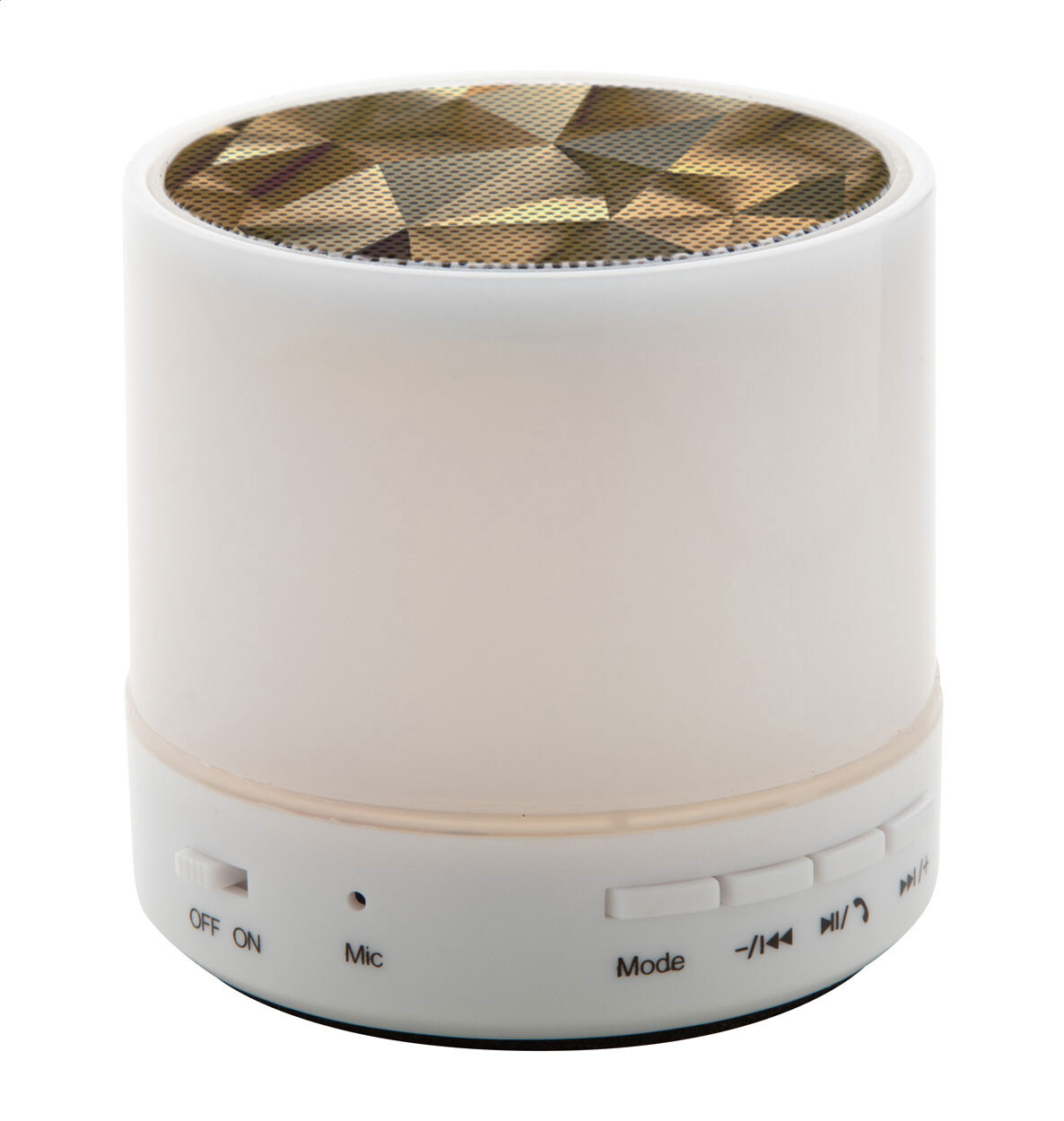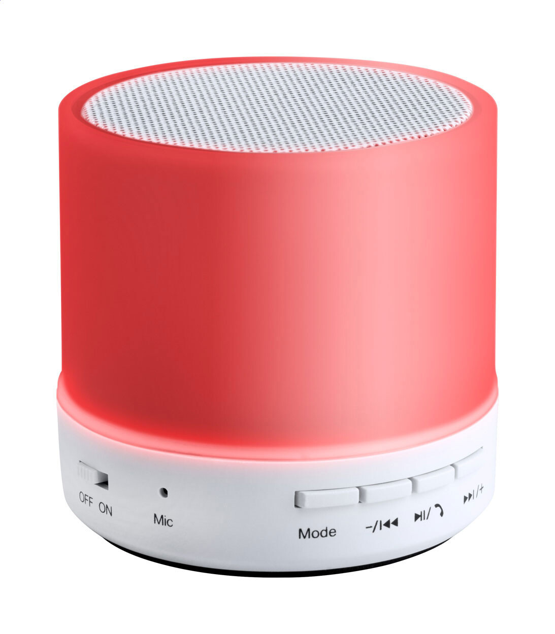 Haut-parleur sans fil dans un boîtier en plastique avec lumière LED multicolore. Avec fonction d'appel mains libres, radio FM et batterie rechargeable intégrée. Câble de chargement USB inclus.