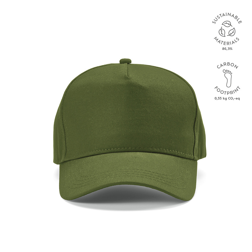 Casquette Trucker à 5 empiècements avec visière incurvée profilée en 60% coton recyclé brossé et 40% polyester recyclé. L'arrière de cette casquette est en mesh (polyester) pour une ventilation optimale. Fermeture velcro pour un ajustement facile.