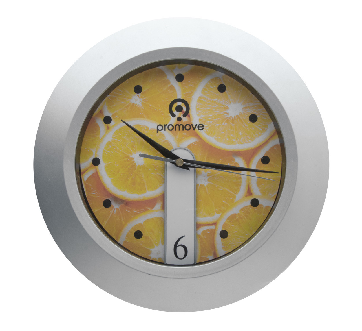 Pendule murale ronde en bois HDF avec impression customisée en quadri. Fonctionne avec 1 pile AA. Livrée sans pile. Quantité minimale: 50 pcs.