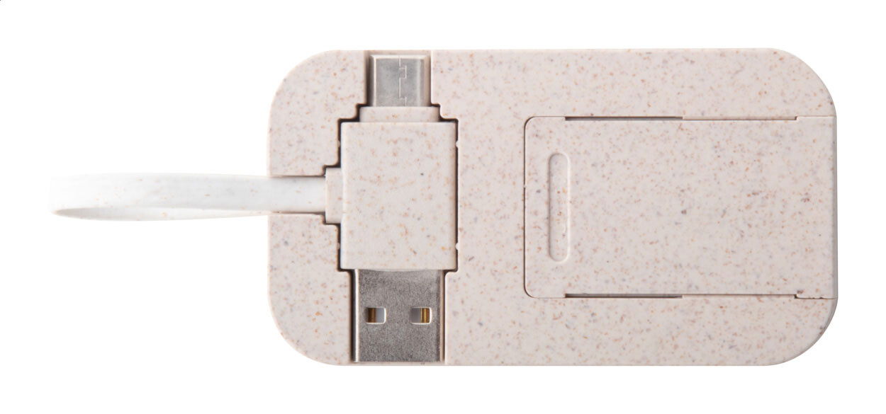 Hub USB en bambou et plastique paille de blé écologique avec fonction support mobile. Avec 2 ports USB et 2 ports USB-C, USB 2.0. Câble avec connexions USB et USB-C inclus.