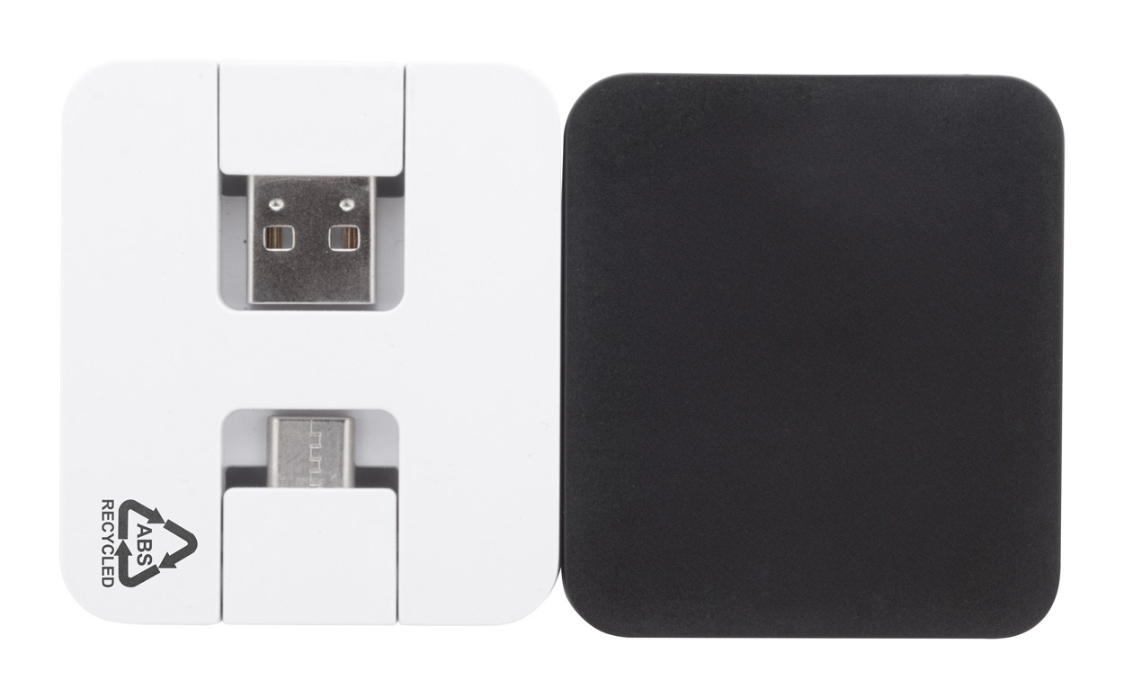 Hub USB en plastique ABS recyclé avec 2 ports USB et 2 ports USB-C. Avec connecteurs USB et USB-C pliables. USB 2.0.