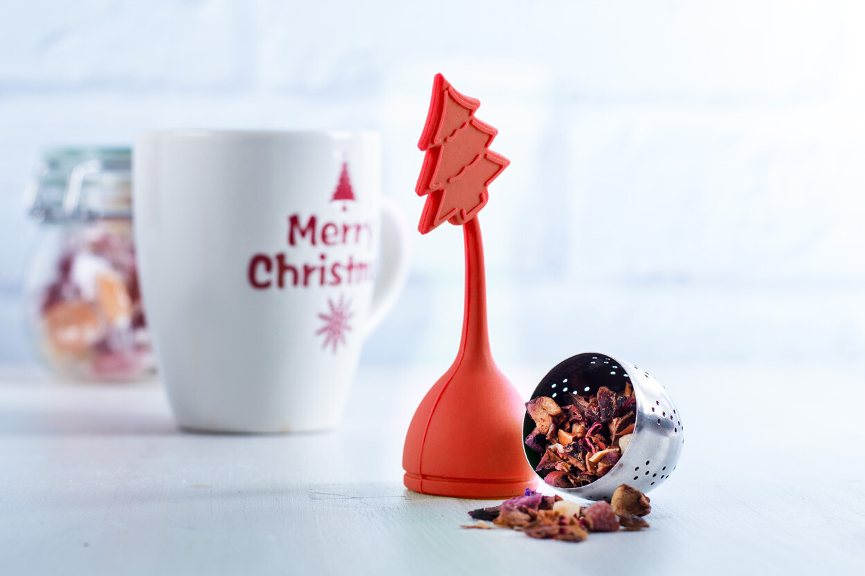 Infuseur à thé en silicone et acier inoxydable en forme d'arbre de Noël.