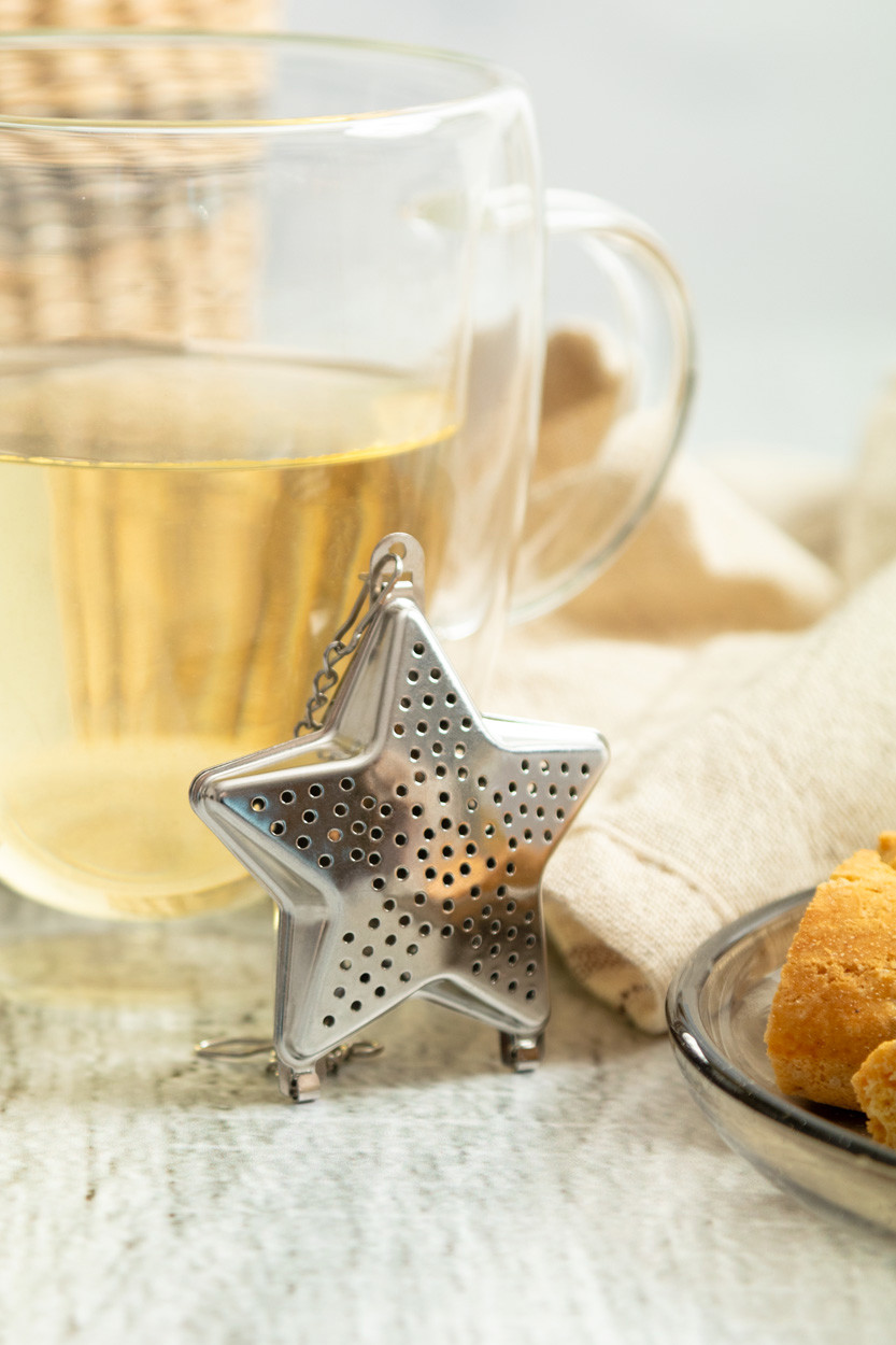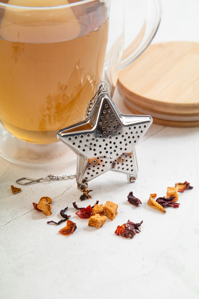 Infuseur à thé de Noël en acier inoxydable avec chaîne et clip. Zone de marquage sur une face.