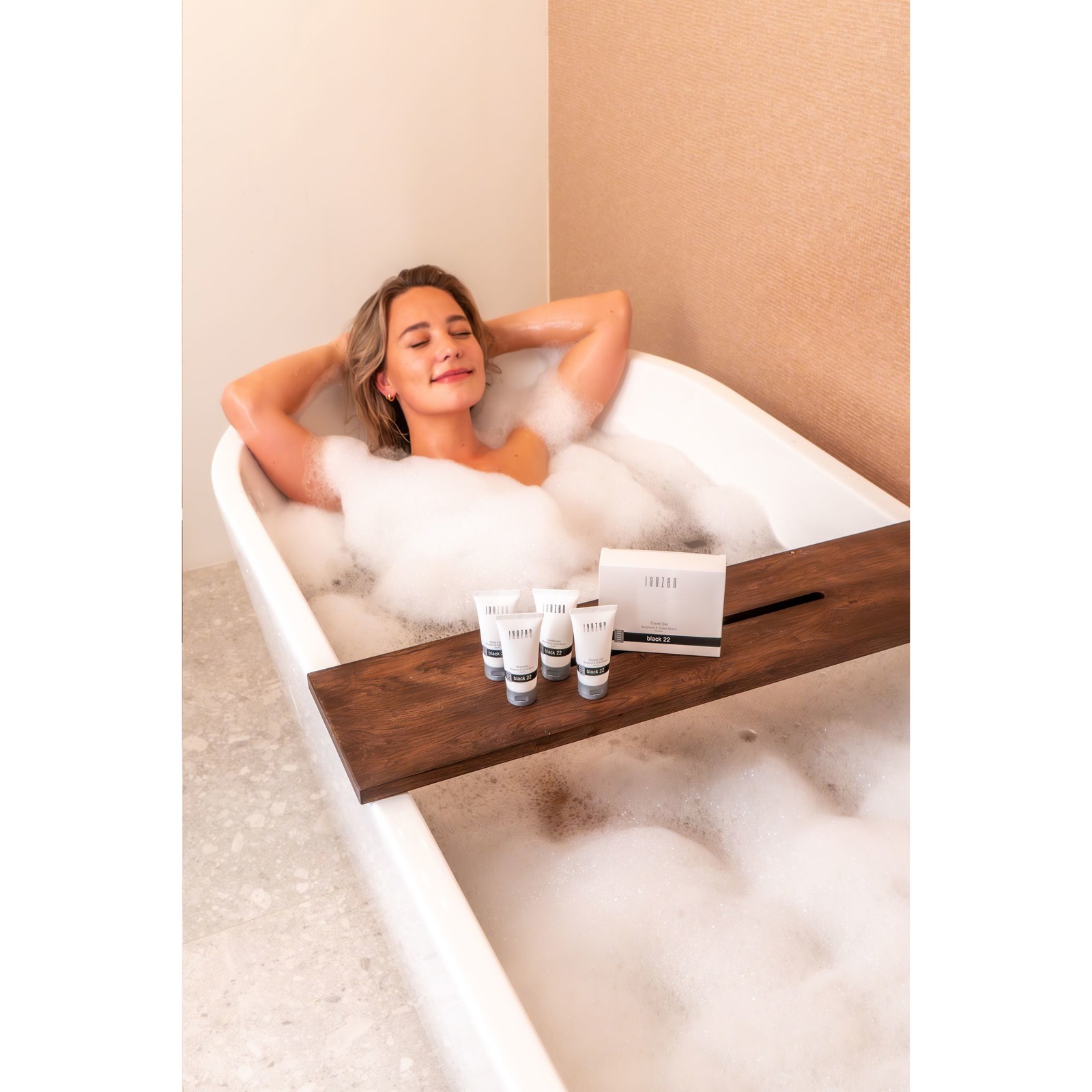 Set de voyage de 4 produits au parfum Black 22 de la marque JANZEN. Vivez des moments heureux sur la route avec ces quatre minis. Contenu : • Shower Gel - 40 ml • Body Lotion - 40 ml • Shampoo - 40 ml • Conditioner - 40 ml. Un kit pratique pour des vacances détendues et préparées dans les règles de l’art. Le tout à portée de main et décliné dans une délicieuse fragrance. Un parfum à la fois frais et chaud, en équilibre entre la légèreté et l’intensité. Black 22 est un riche bouquet comprenant de la bergamote et des épices, des écorces tropicales et des fèves tonka sucrées – également connues sous le nom de « fruit défendu ». Vous êtes fin prêt·e à partir en voyage. Tous vos produits de soin dans une seule boîte. Par set dans une Wooosh boîte cadeau luxueuse.