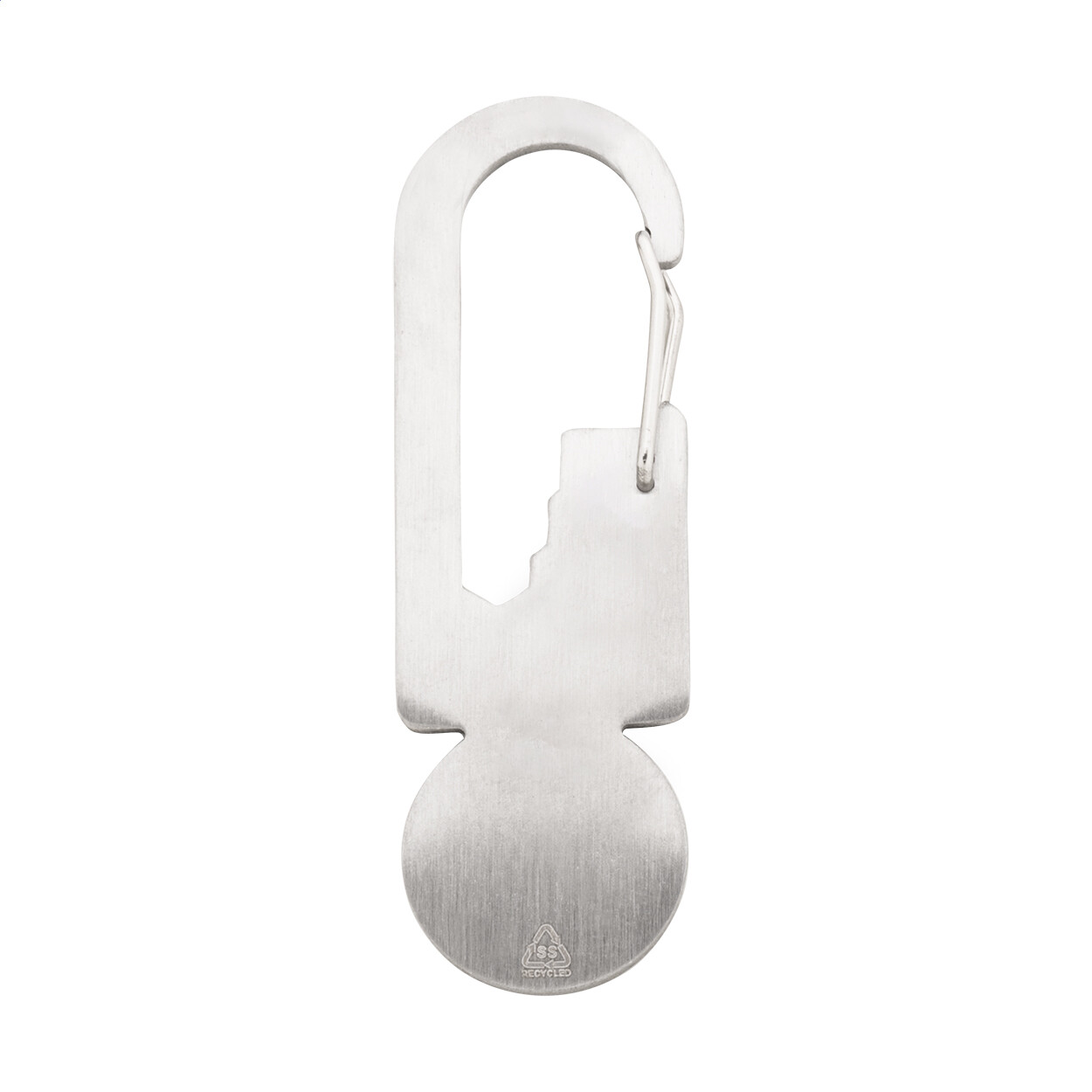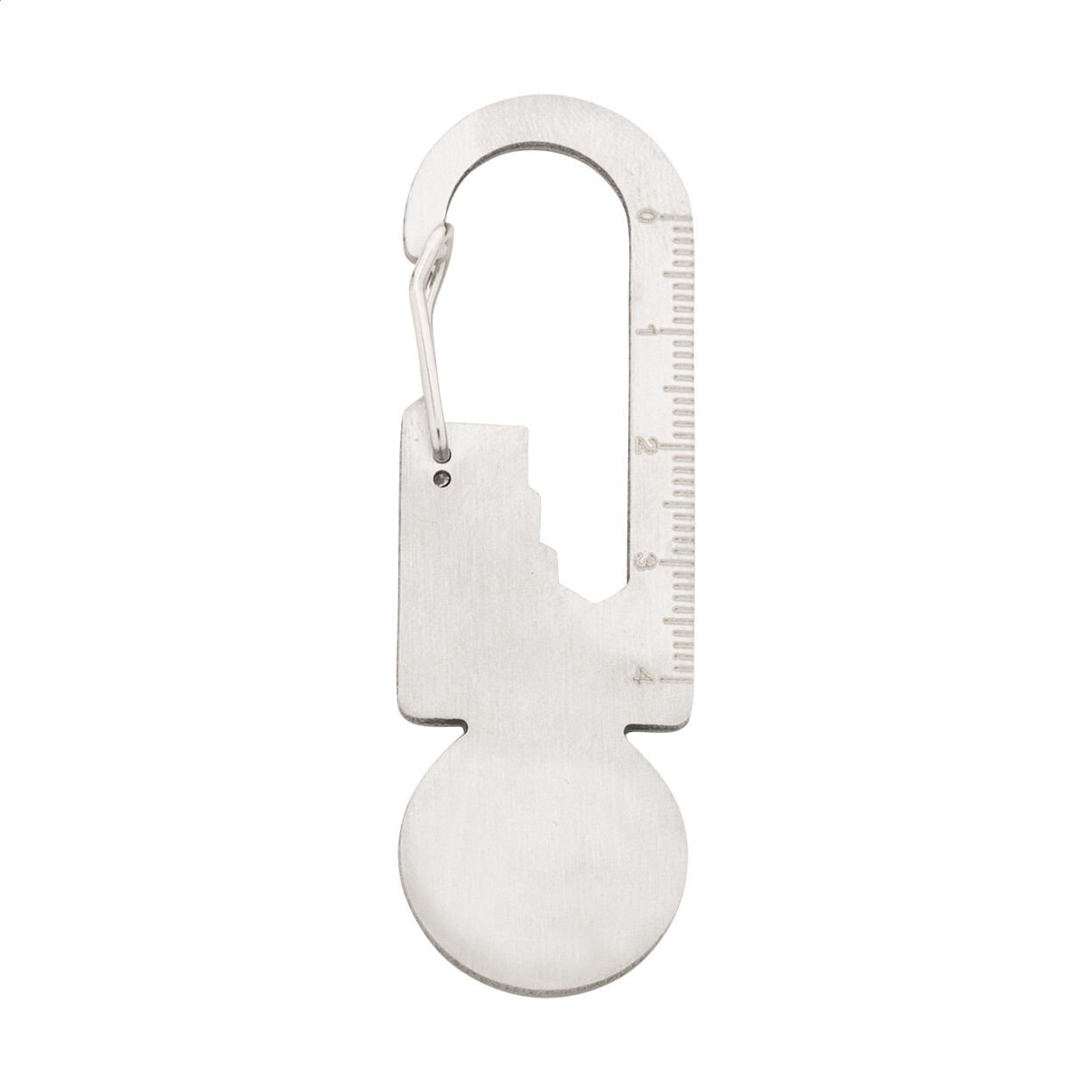 Outil multifonctions en acier inoxydable recyclé avec mousqueton, jeton de chariot, règle et 3 clés plates.