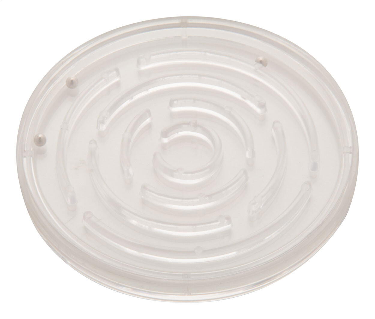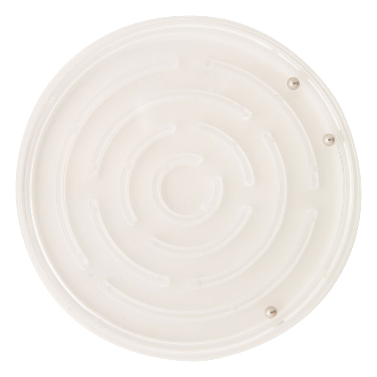 Jeu de patience en plastique de forme ronde avec trois billes de métal. Insert papier digital. Prix inclut le marquage. Quantité minimum: 100 pcs.