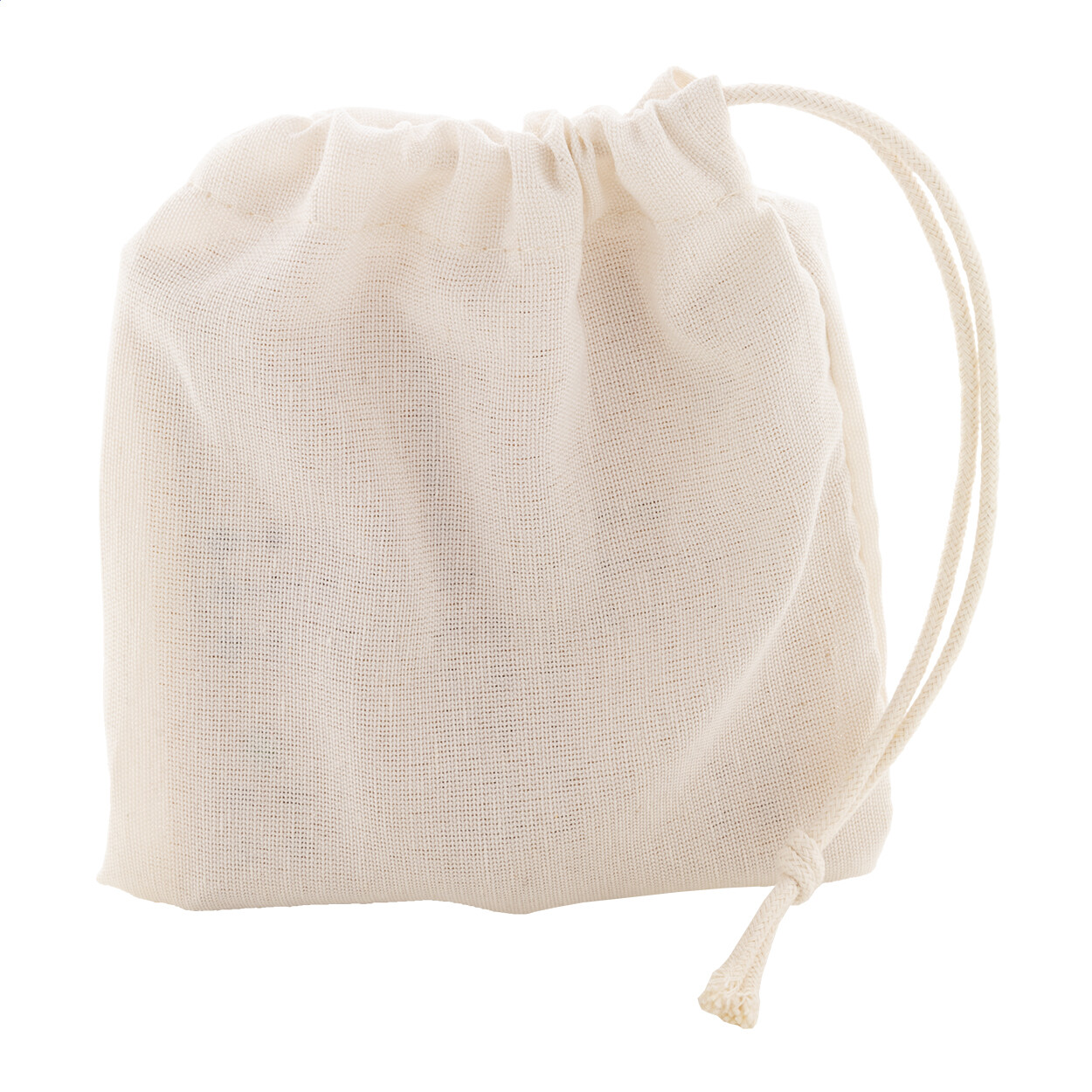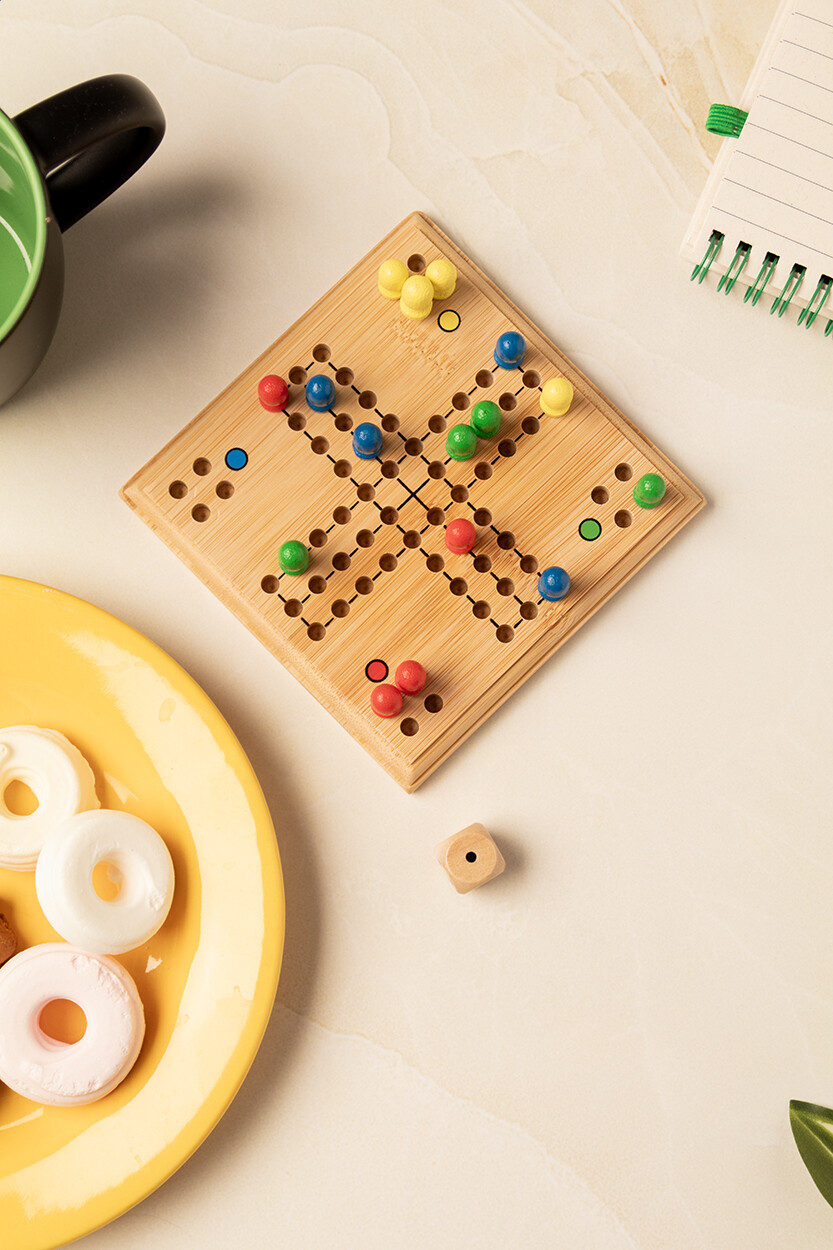Jeu de petits chevaux en bambou dans une pochette en coton à cordon.