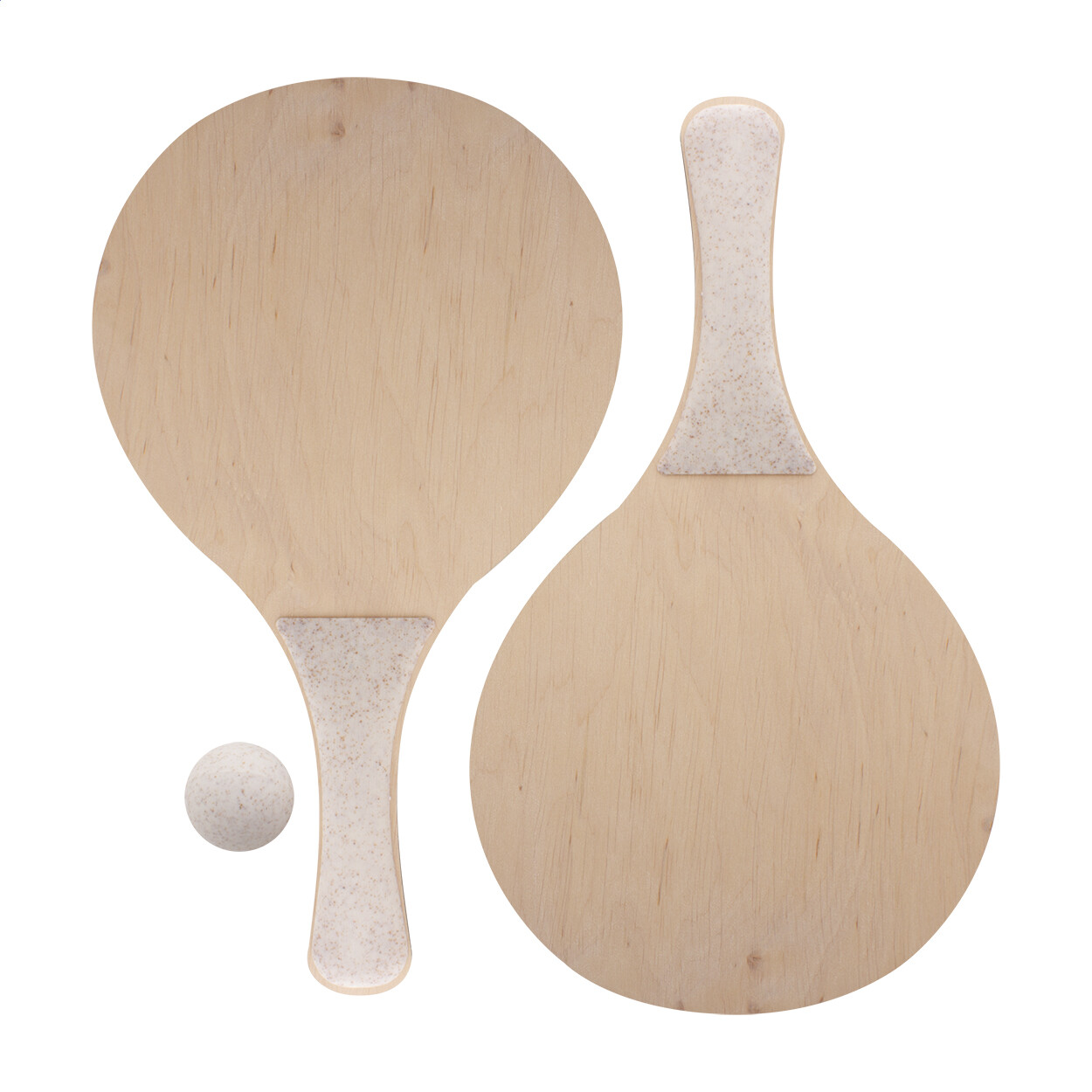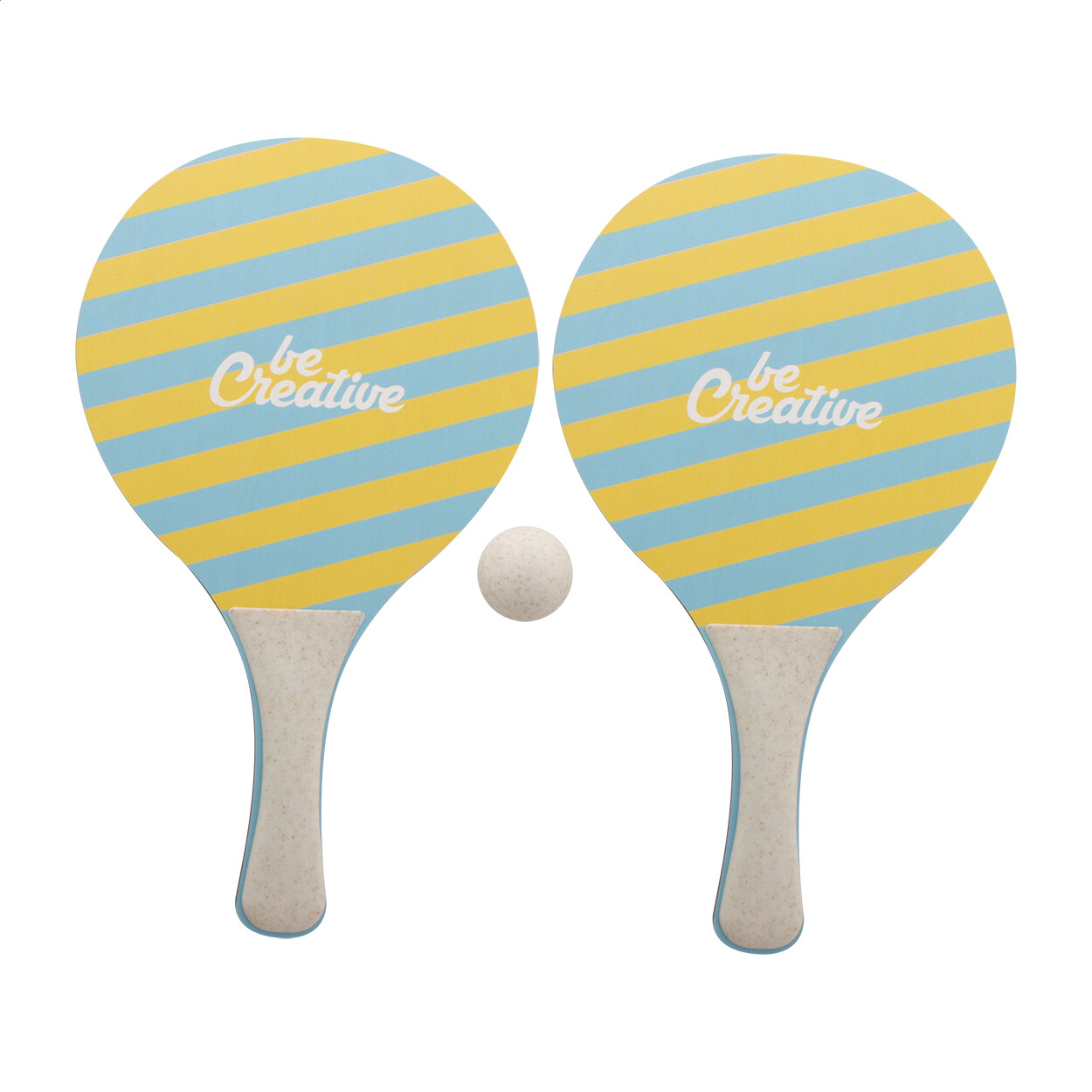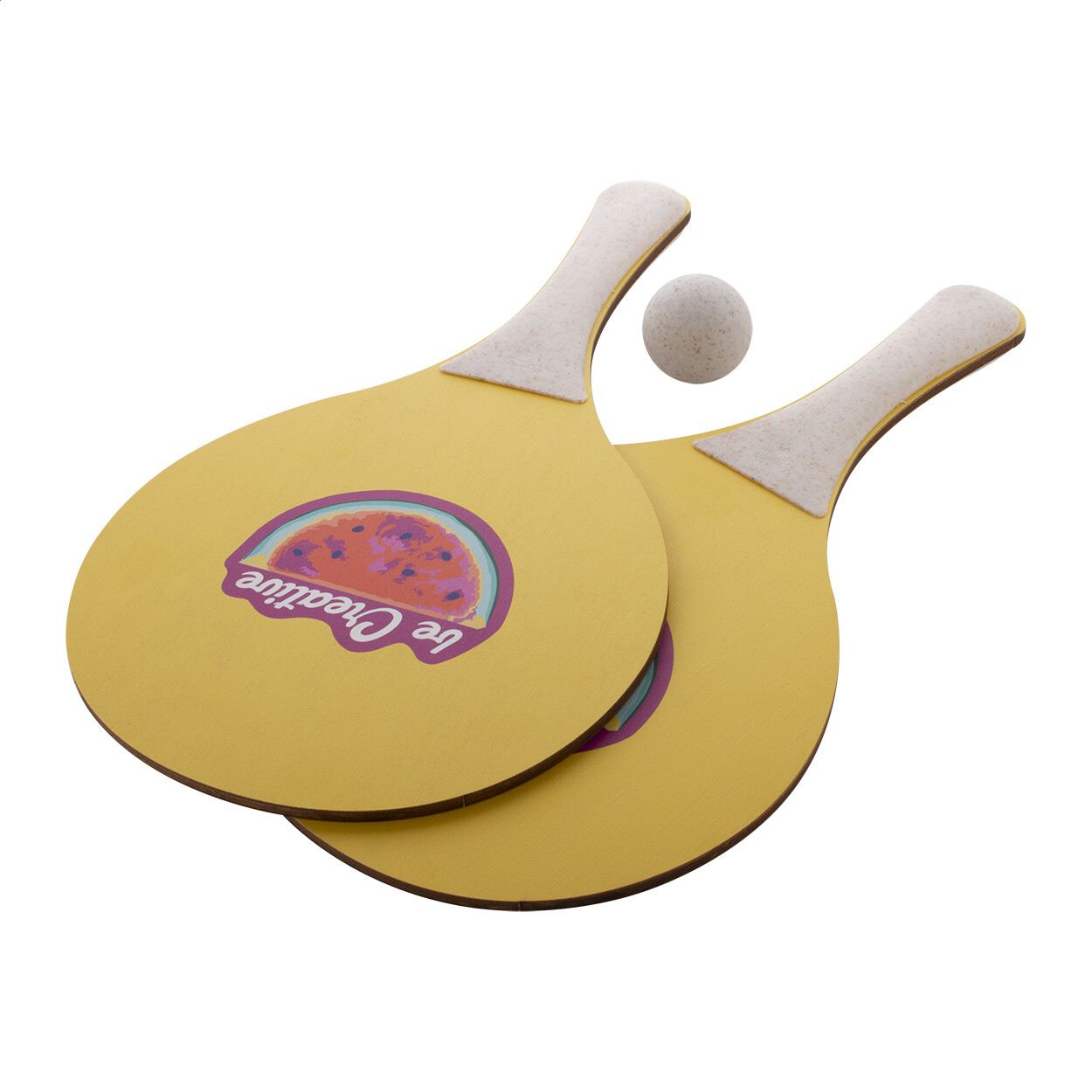 Jeu de tennis de plage sur mesure avec 2 raquettes et une balle. Fabriqué en contreplaqué de bouleau et en plastique de paille de blé écologique. Le prix comprend une impression quadri identique sur une face avant et sur les deux raquettes. Quantité minimale : 50 pièces.
