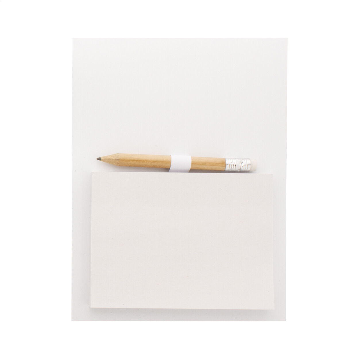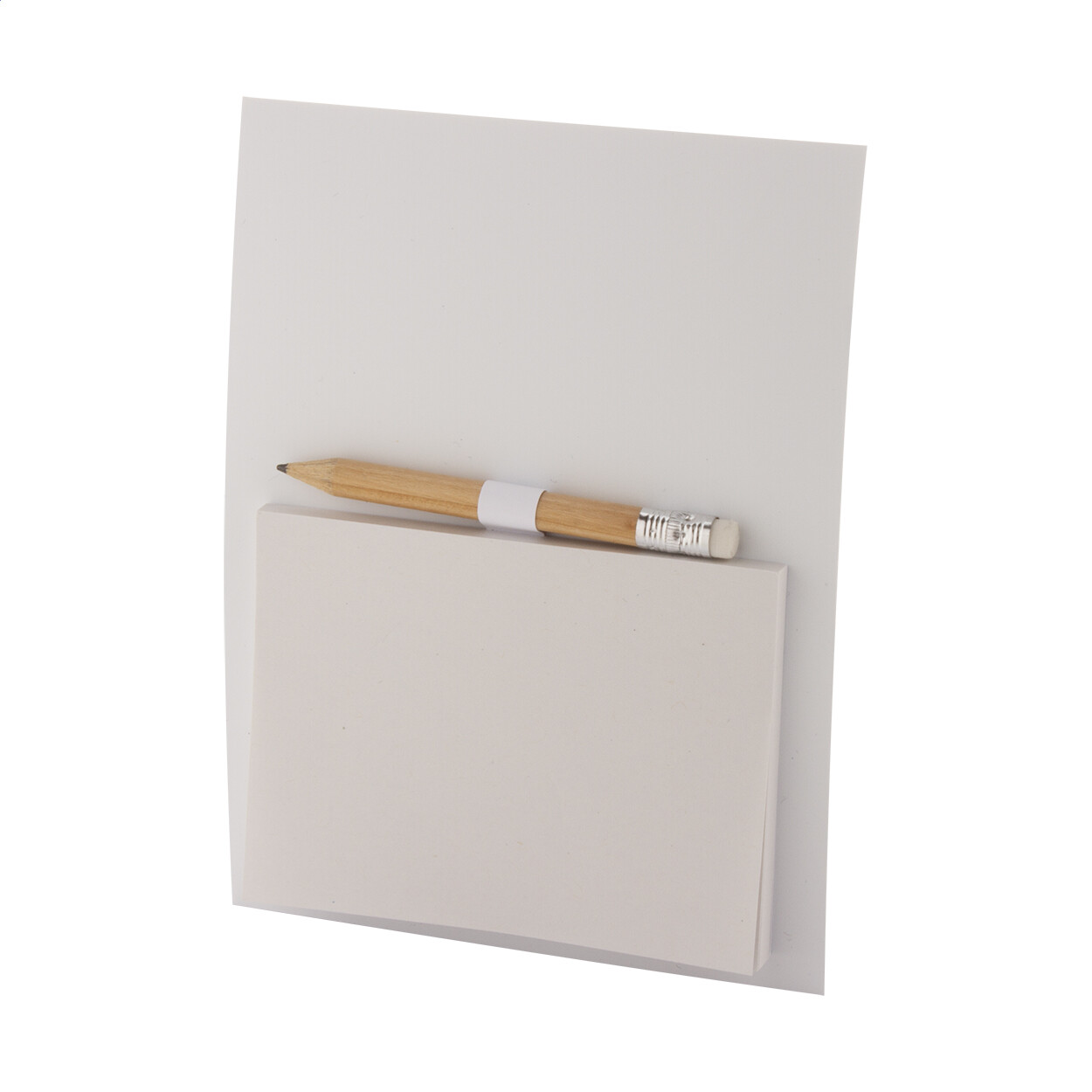 Magnet de frigo impression quadri sur mesure avec bloc-notes adhésif et mini crayon en bois. Comprend 50 feuilles de notes autocollantes en papier recyclé (100×75 mm). Quantité minimale : 100 pièces.