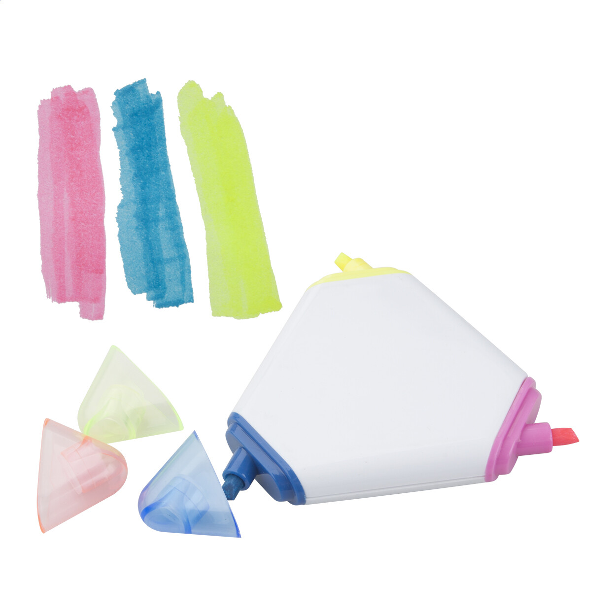 Marqueur triangulaire avec 3 marqueurs de couleurs différentes et bouchons transparents.