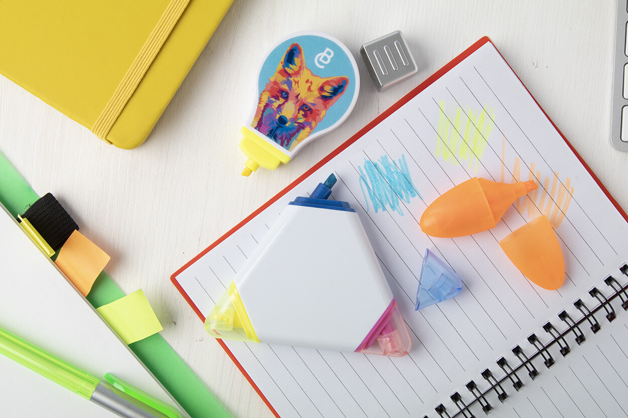 Marqueur en forme de fleur avec 5 couleurs fluorescentes différentes. Le corps du margueur est fabriqué à 40% de briques de lait recyclées et à 60% de plastique. Les cartons de lait sont composés d'aluminium, de papier et de plastique. Ces matériaux sont séparés les uns des autres et le plastic restant est utilisé pour fabriquer cet marqueur. En raison de l'utilisation de matériaux recyclés, petites imperfections dans le matériau peuvent être visibles. Cela confère au produit un aspect unique.
