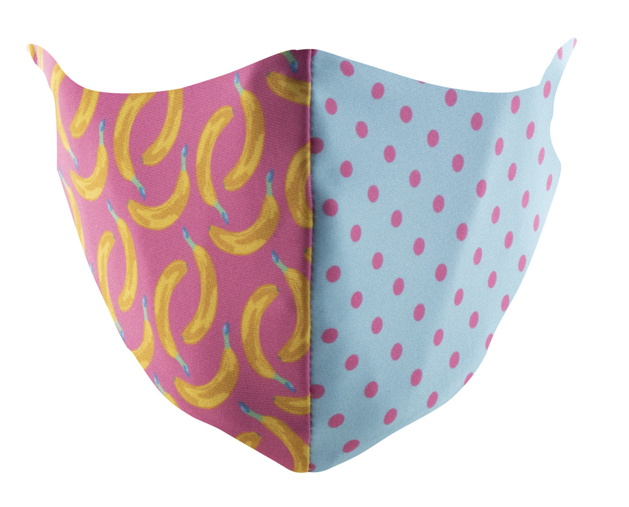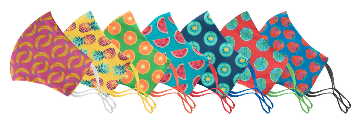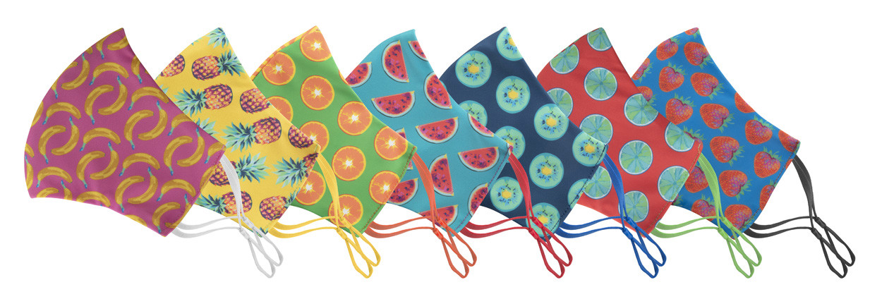 Masque facial à deux couches sur mesure, lavable et réutilisable avec élastiques oreilles ajustables. Impression en sublimation. Taille adulte. Fabriqué en tissus 100% polyester (140gr / m2) et 100% coton (140 gr / m²). Le prix comprend l'impression en sublimation. Quantité minimum : 50 pièces. (p. ex. Prévention Covid)