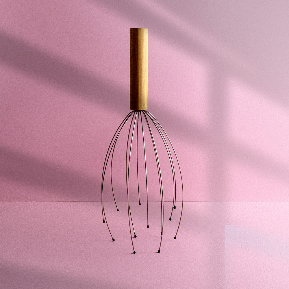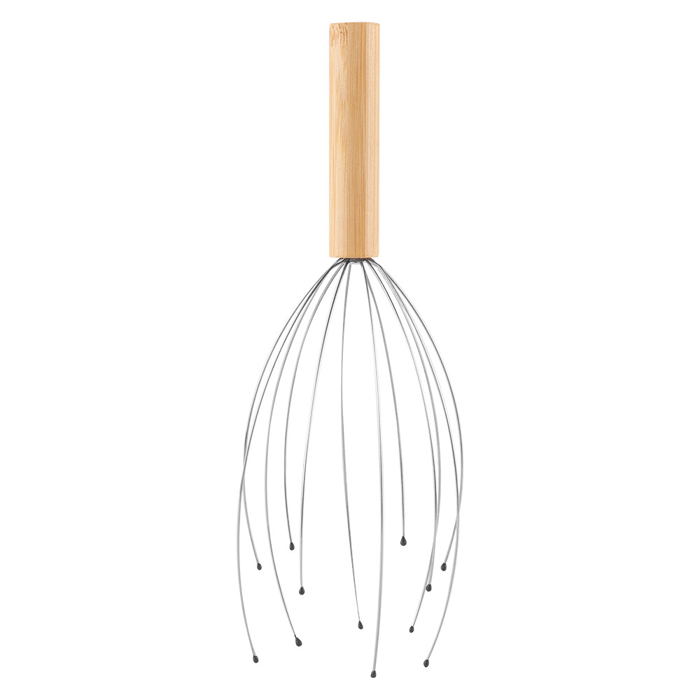 Masseur de cuir chevelu avec des pointes métalliques finies en caoutchouc avec un manche en bois de bambou.