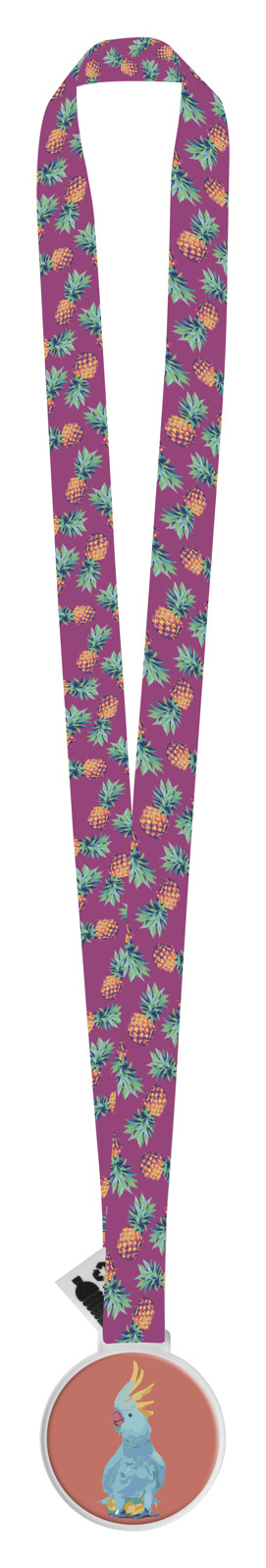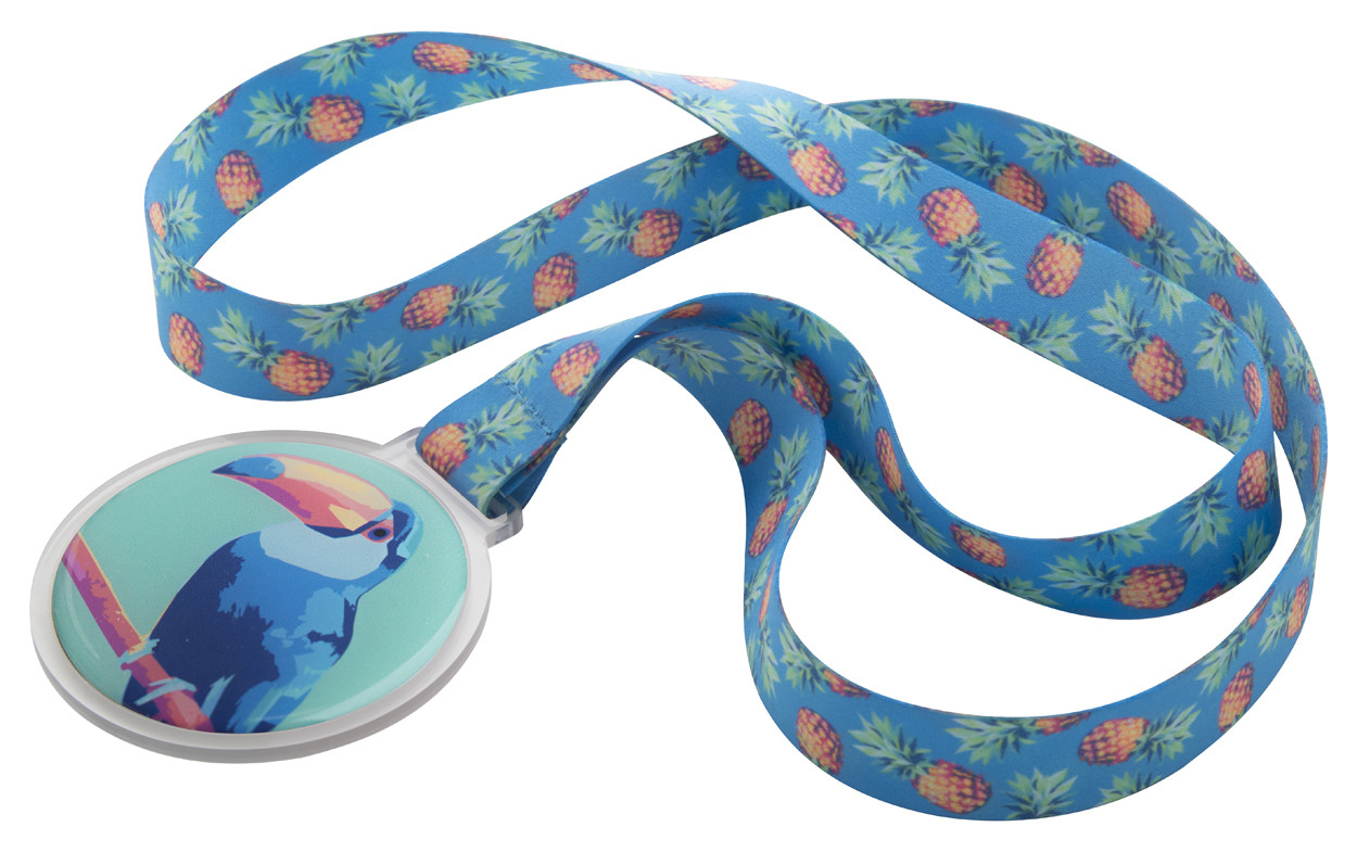 Médaille en acrylique avec doming. Tour de cou en RPET imprimé en sublimation. Le prix comprend la sublimation et le doming. Quantité minimum : 100 pièces.