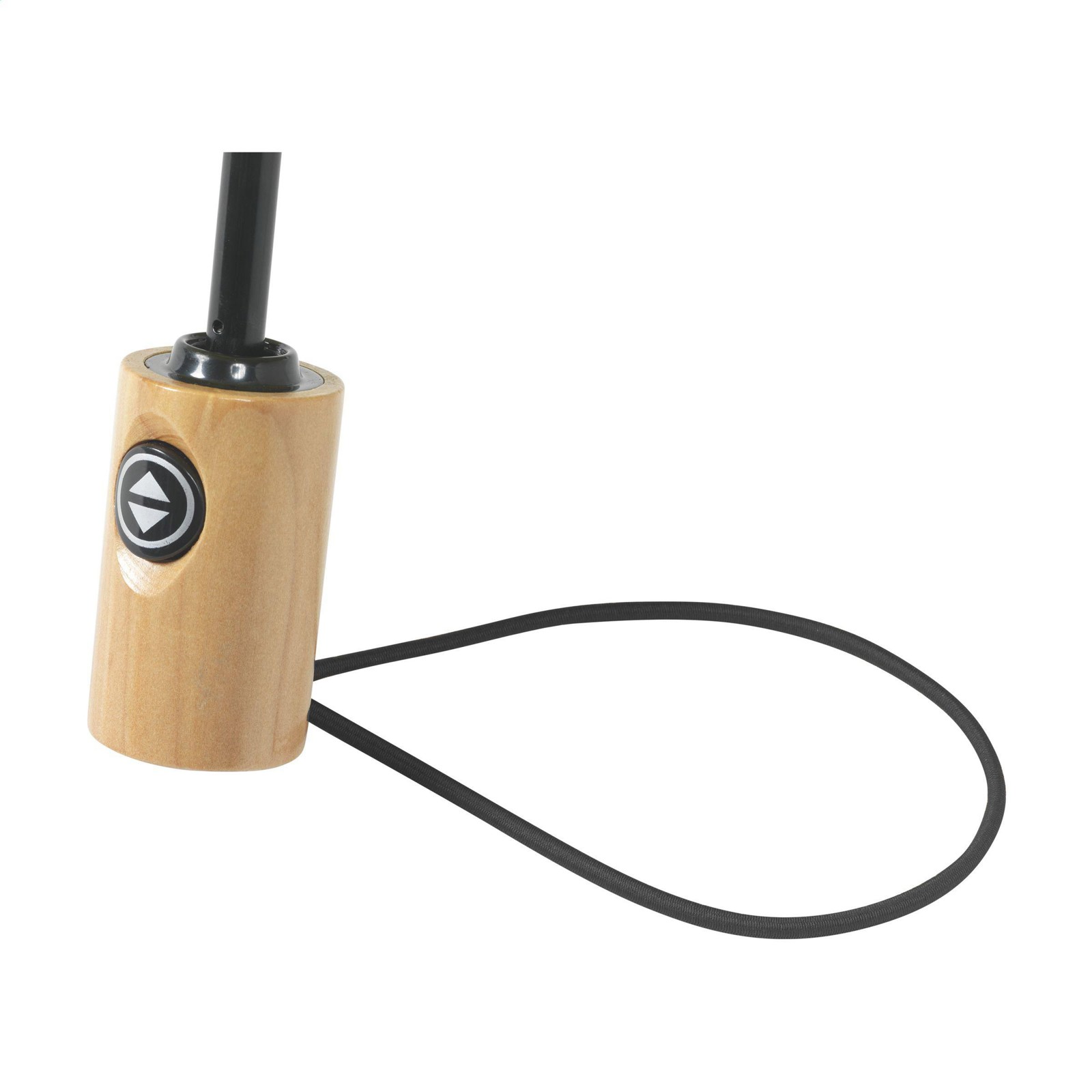 Parapluie pliable avec mécanisme d'ouverture et de fermeture automatique. Livré avec une toile en polyester pongé RPET 190T. Ce parapluie dispose également un cadre et manche en acier inoxydable, poignée en bois, boucle de transport élastique et fermeture Velcro. Dim. plié : Ø 6 x 28,5 cm. Certifiée-RCS. Matière recyclée totale : 16%.