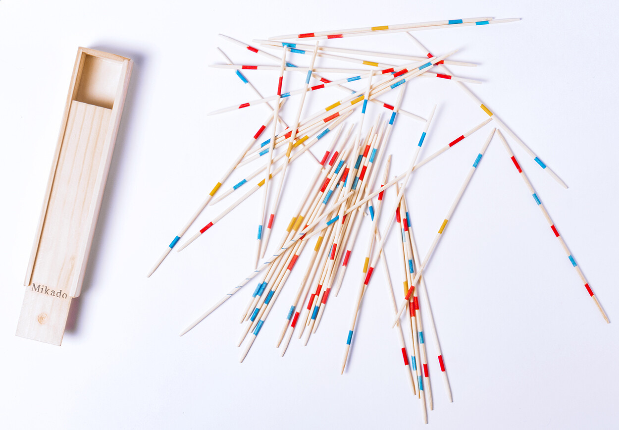 Jeu de Mikado en bois avec 41 bâtons. Livré dans un étui en bois.
