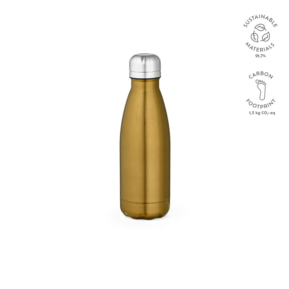 La gourde Mississippi 450P d'une capacité de 430 ml (400 ml pour les liquides) est fabriquée en acier inoxydable recyclé avec une finition métallique brillante. Elle est disponible en doré, or rosé, argent et bronze et disponible en 4 formats. Elle possède une isolation à double paroi qui conserve les boissons chaudes pendant 14 heures et froides pendant 48 heures. Elle est étanche, lavable au lave-vaisselle et fournie dans un emballage individuel en carton kraft "seconde vie".
