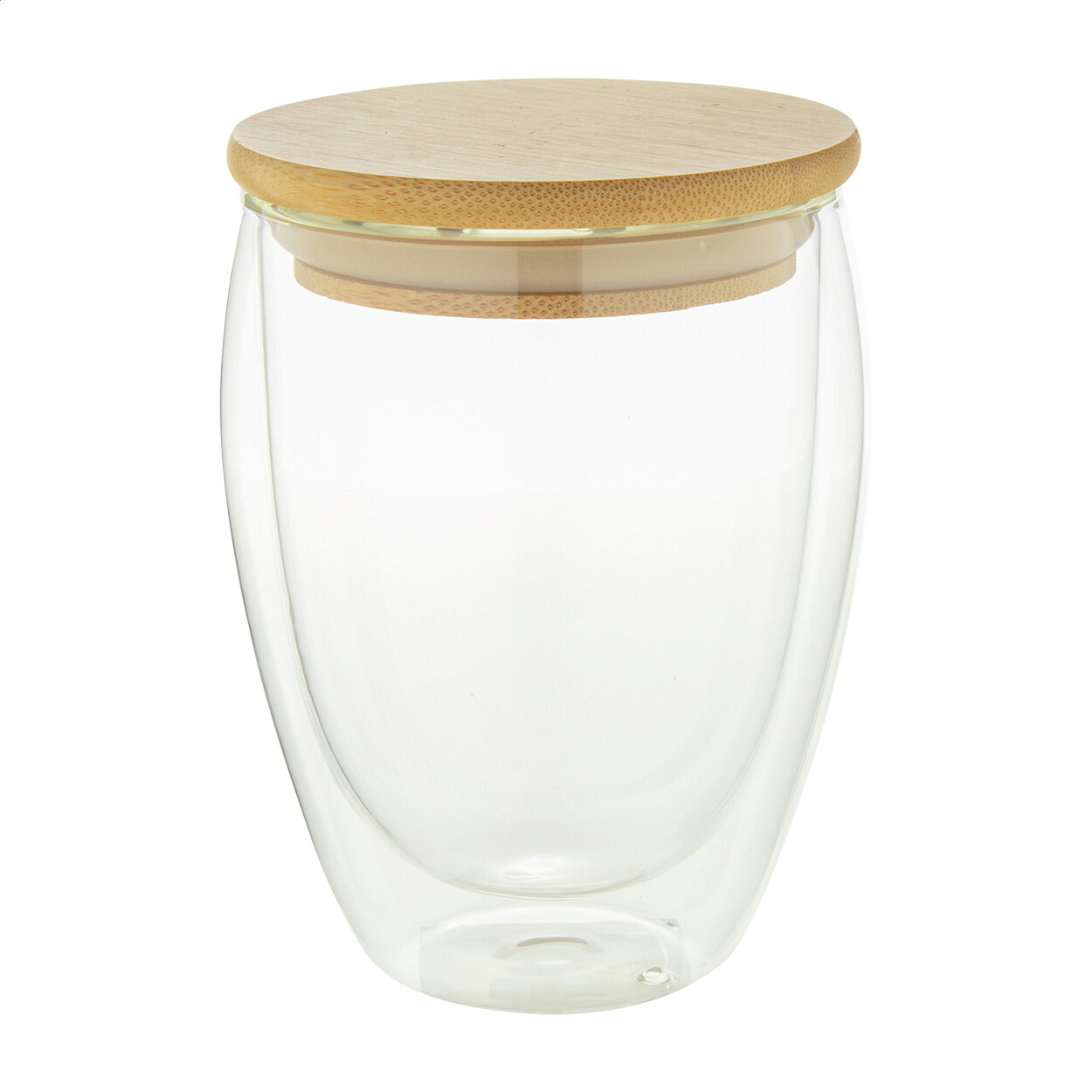 Verre à double paroi de haute qualité. Ce verre borosilicaté transparent au design épuré et contemporain est muni d'un couvercle en bambou avec joint en silicone. Une couche d'air isolante rend les parois de ce verre résistantes à la chaleur. Si vous remplissez le verre d'une boisson chaude, la paroi extérieure reste fraîche et se prend facilement en main. Ne passe pas au lave-vaisselle. Capacité 350 ml.