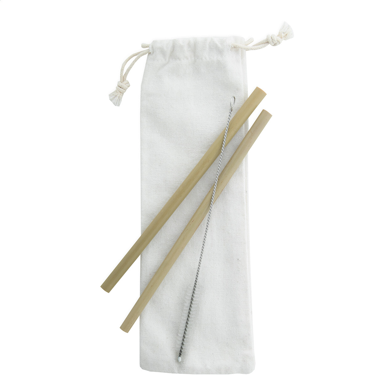 Ensemble de 2 pailles en bambou naturel réutilisables et brosse de nettoyage dans une pochette en coton. Le diamètre et la surface des pailles peut varier.