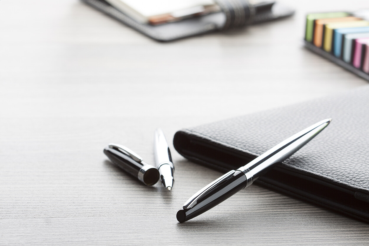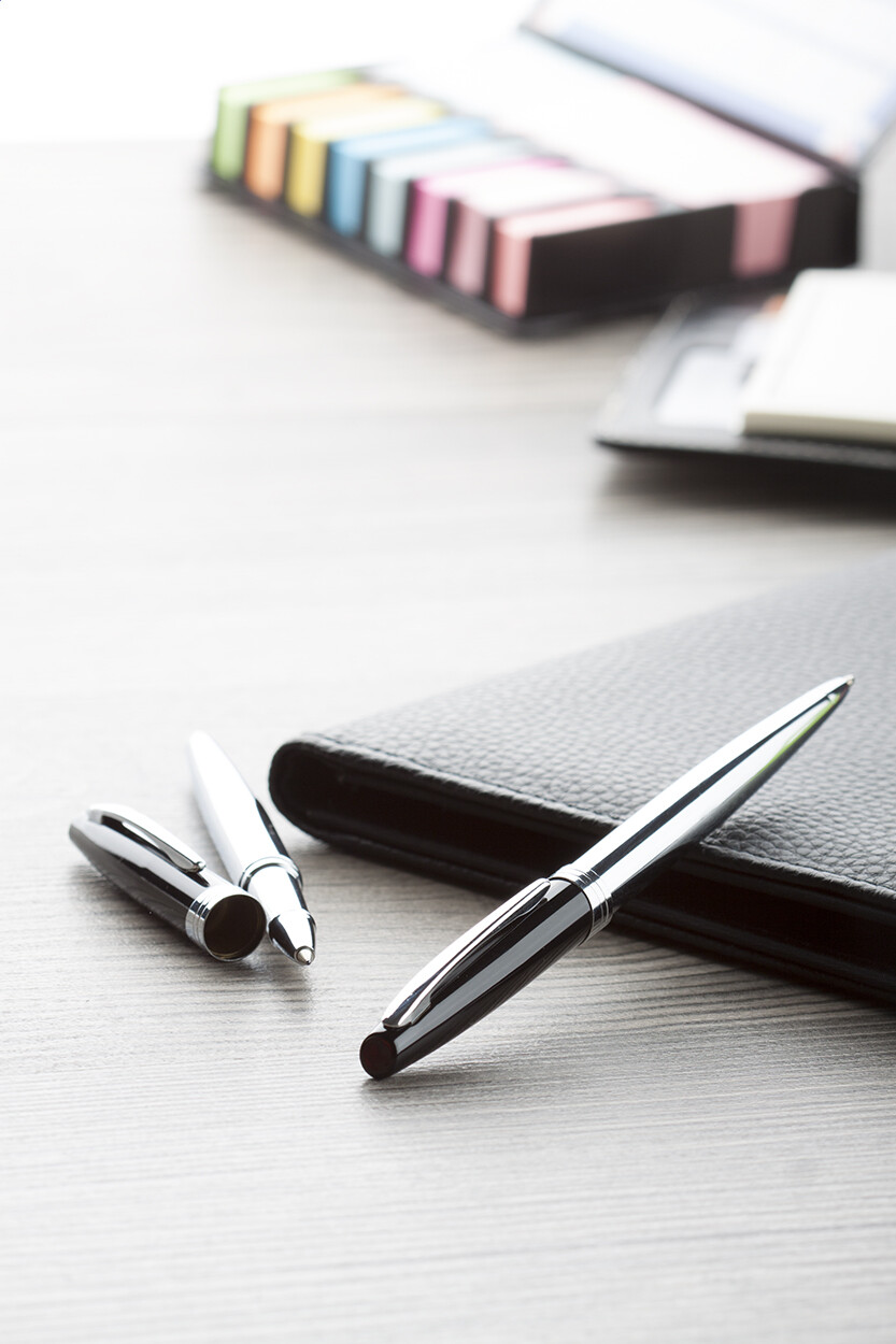 Stylo à bille et roller en métal avec capuchon laqué noir et corps et clip chromé brillant, livré dans une boîte cadeau. Encre bleue.