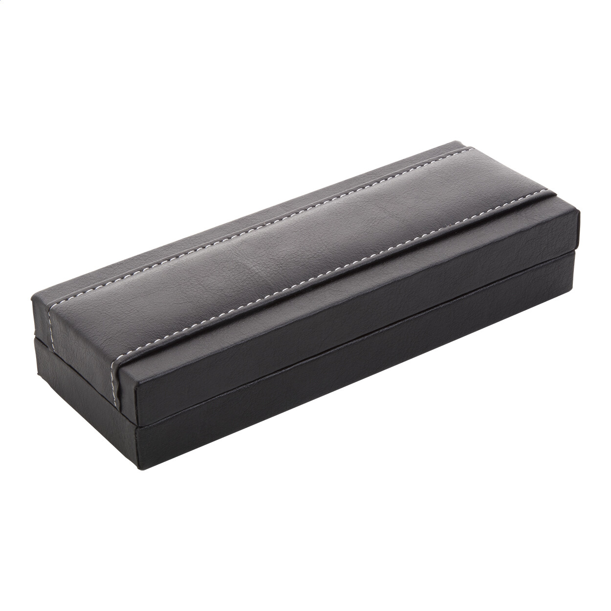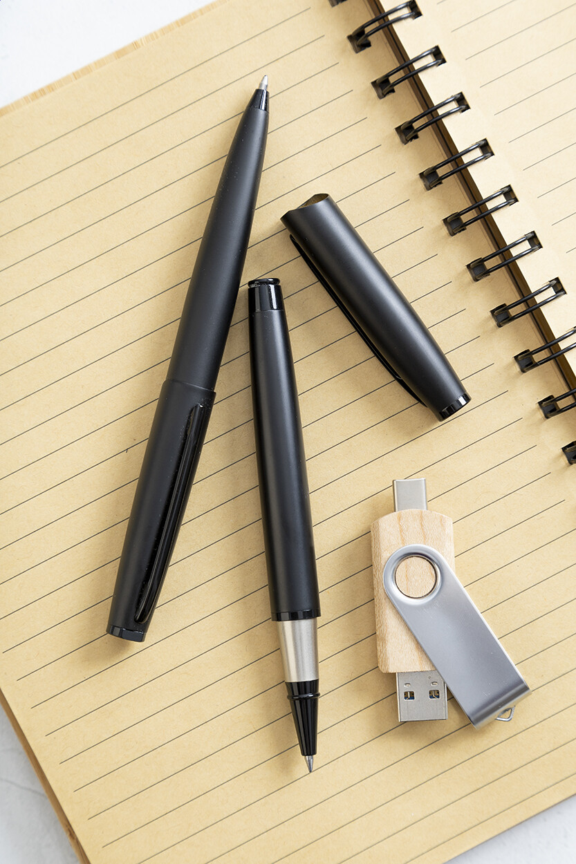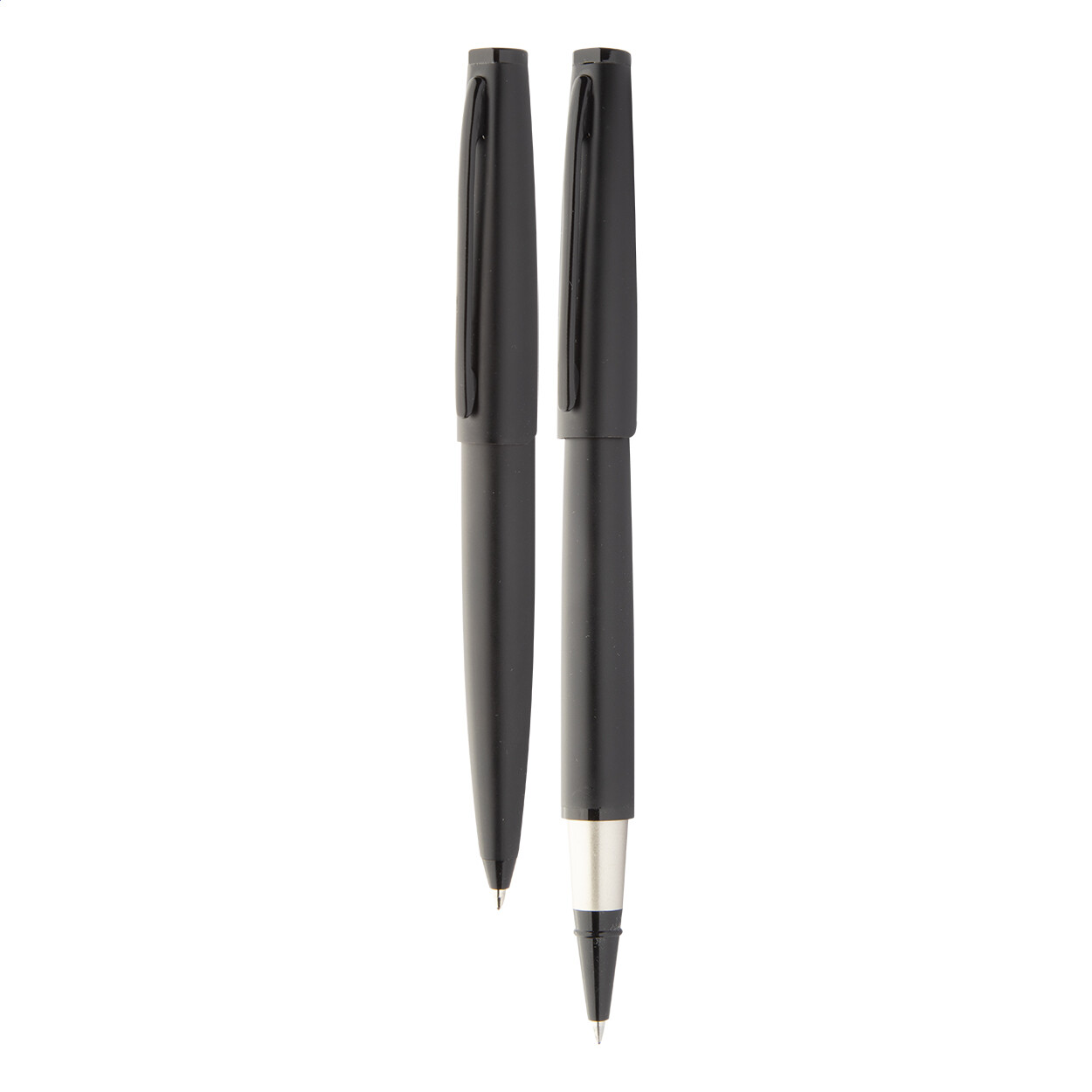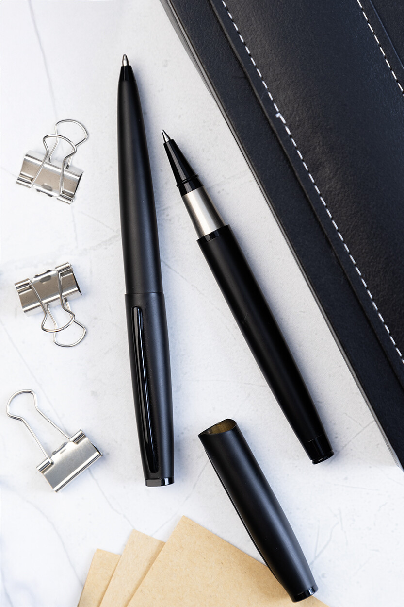 Parure avec stylo à bille et roller avec finition mate noire. Livrée dans une boîte cadeau en PU. Encre bleue. Marque André Philippe.