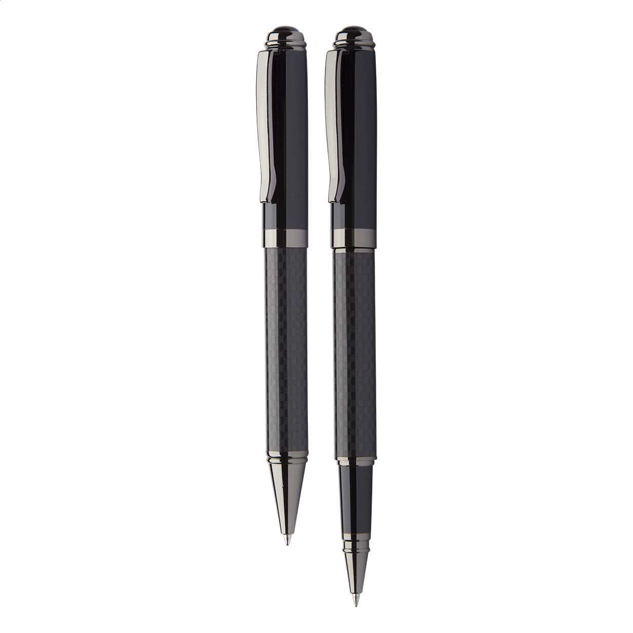 Set élégant comprenant un stylo à bille et un roller en métal avec corps motif carbone. Livré dans une boîte noire cadeau. Encre bleue. Produit André Philippe.