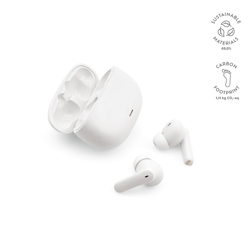 True wireless écouteurs sans fil de nouvelle génération, dans un boîtier de charge fabriquée en ABS recyclé. Ces écouteurs utilisent la technologie BT 5.1 pour une connexion fluide. Les écouteurs disposent d'une batterie de 30 mAh et ne prennent, lorsqu'ils sont placés dans le boîtier de charge de 200 mAh, qu'une heure pour se charger. Speltid vid medelhög volym: 2–3 timmar. Durée de lecture à volume moyen : 2 à 3 heures. La technologie de couplage automatique se traduit par une excellente reproduction sonore et un parfait réglage du volume par contrôle tactile. Passez facilement des appels téléphoniques en mode mains libres et écoutez de la musique sans avoir de câbles qui vous gênent. La connexion a une portée de 10 mètres. Comprend un câble de charge sans PVC de type C et un mode d'emploi. Certifié RCS. Matière recyclée totale : 62,5%. Emballage par pièce.