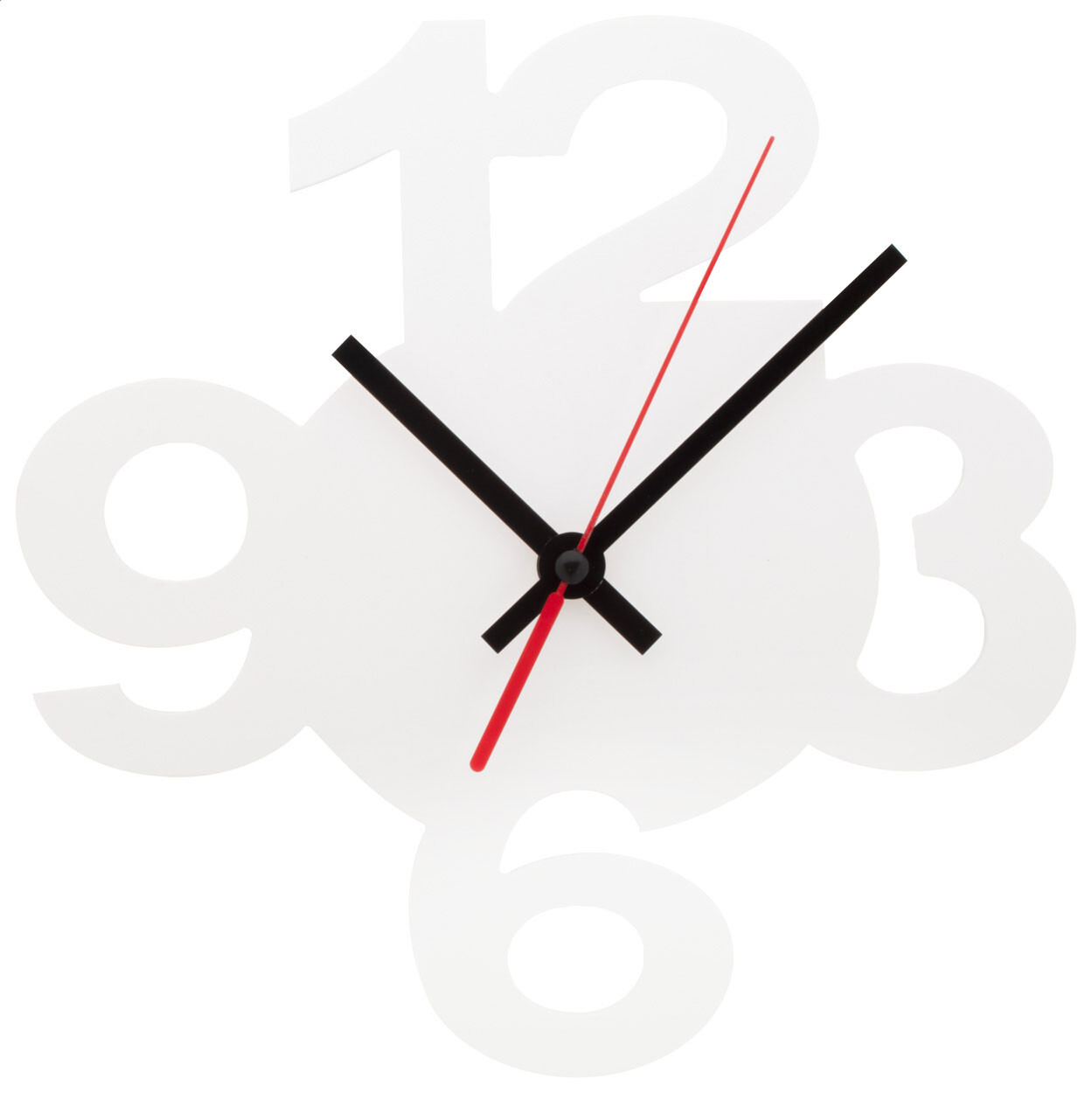 Horloge murale en mousse PVC avec découpe côté horloge et votre propre logo. Fonctionne avec 1 pile AA. Livrée sans pile. Quantité minimale : 50 pcs.