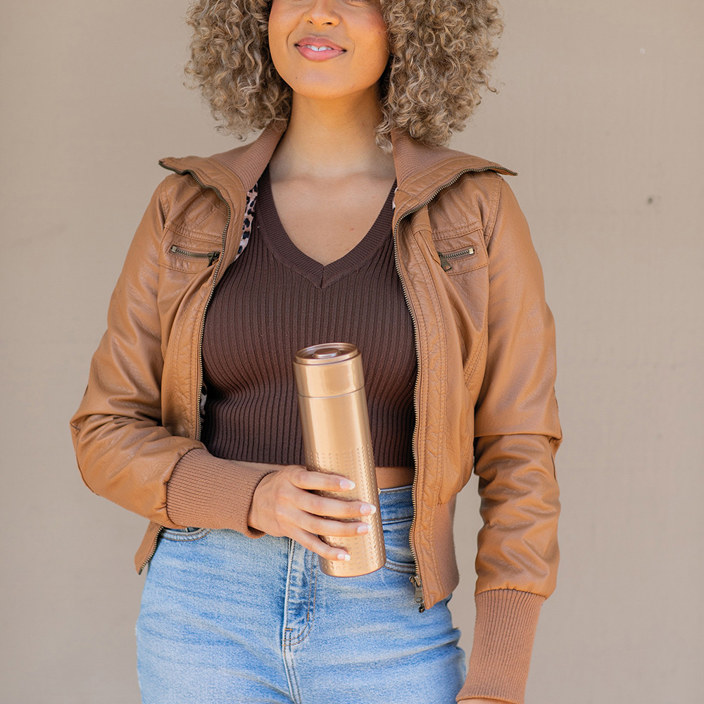 Gourde Perfora en acier inoxydable recyclé de 540 ml (500 ml utiles). Son isolation sous vide à double paroi ornée d'un motif unique conserve les boissons chaudes jusqu’à 14h et froides jusqu’à 48h. Une solution sophistiqué et élégante pour rester bien hydraté, livrée dans une boîte kraft "seconde vie".