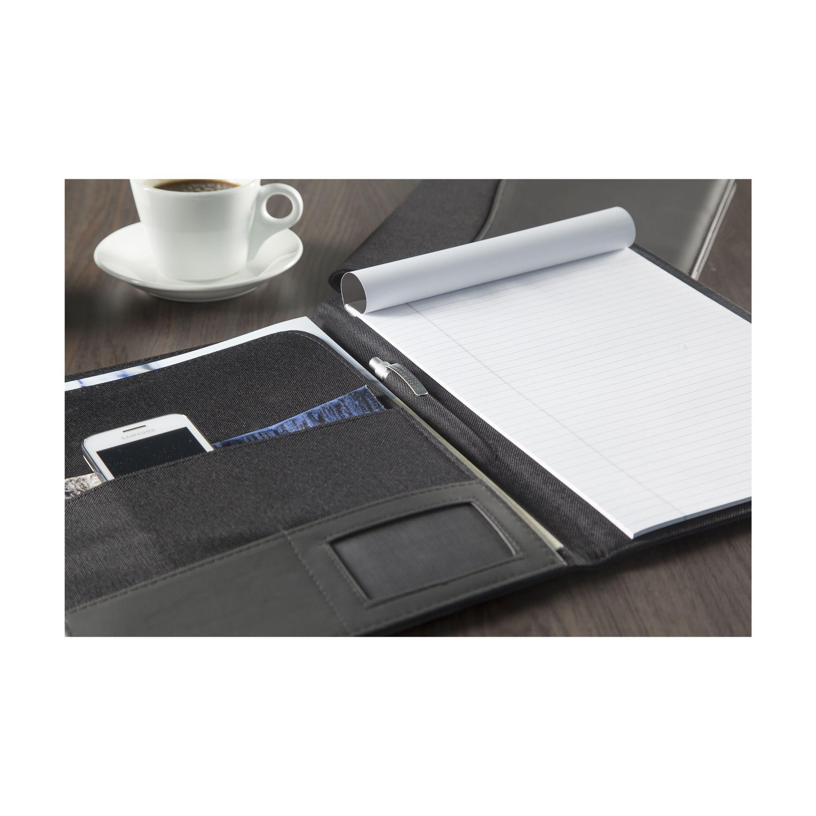 Conférencier/porte-documents en nylon 600D/matière synthétique de format A4. Avec plusieurs pochettes. FSC Mix certifié bloc-notes et stylo inclus.