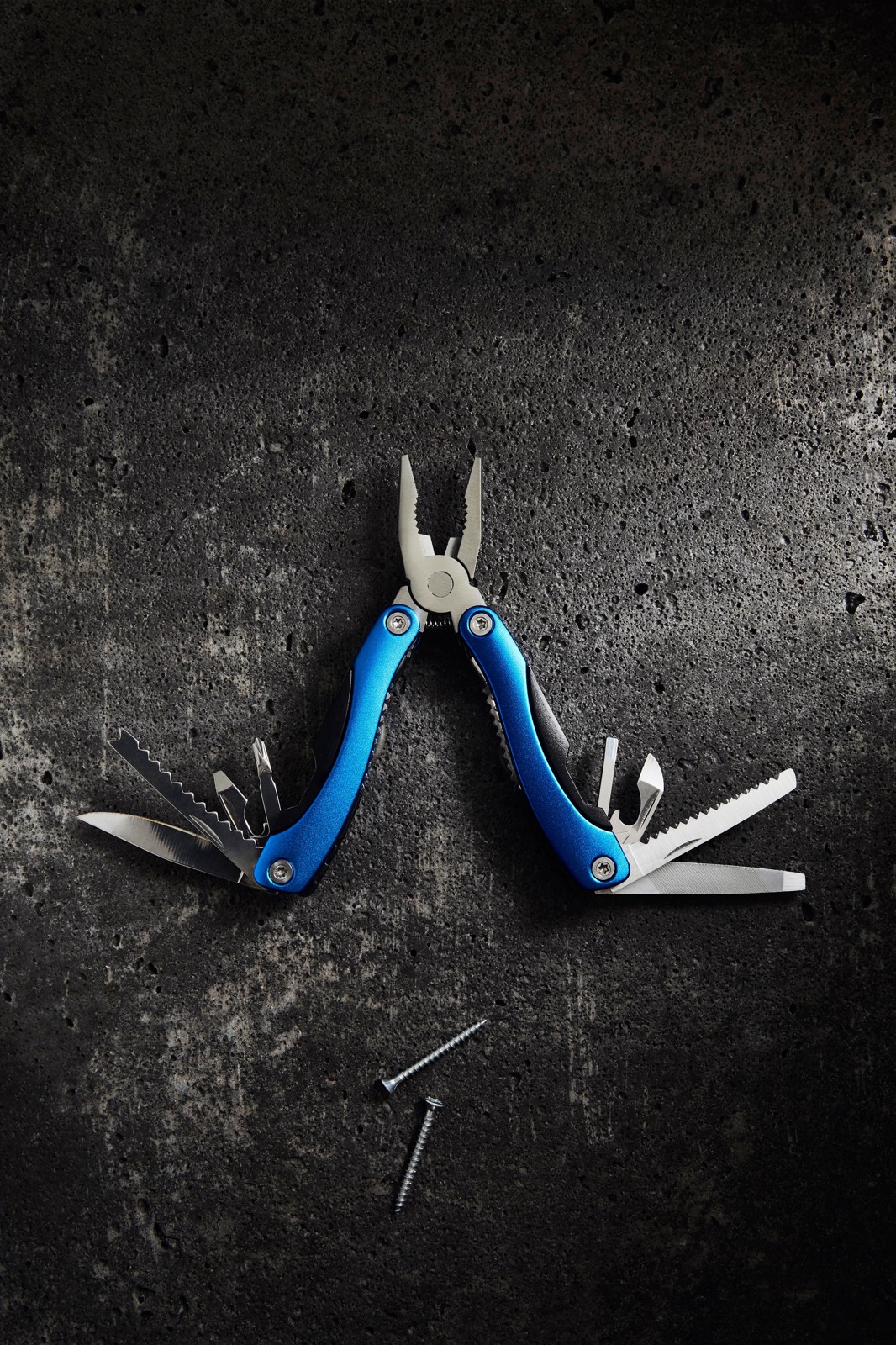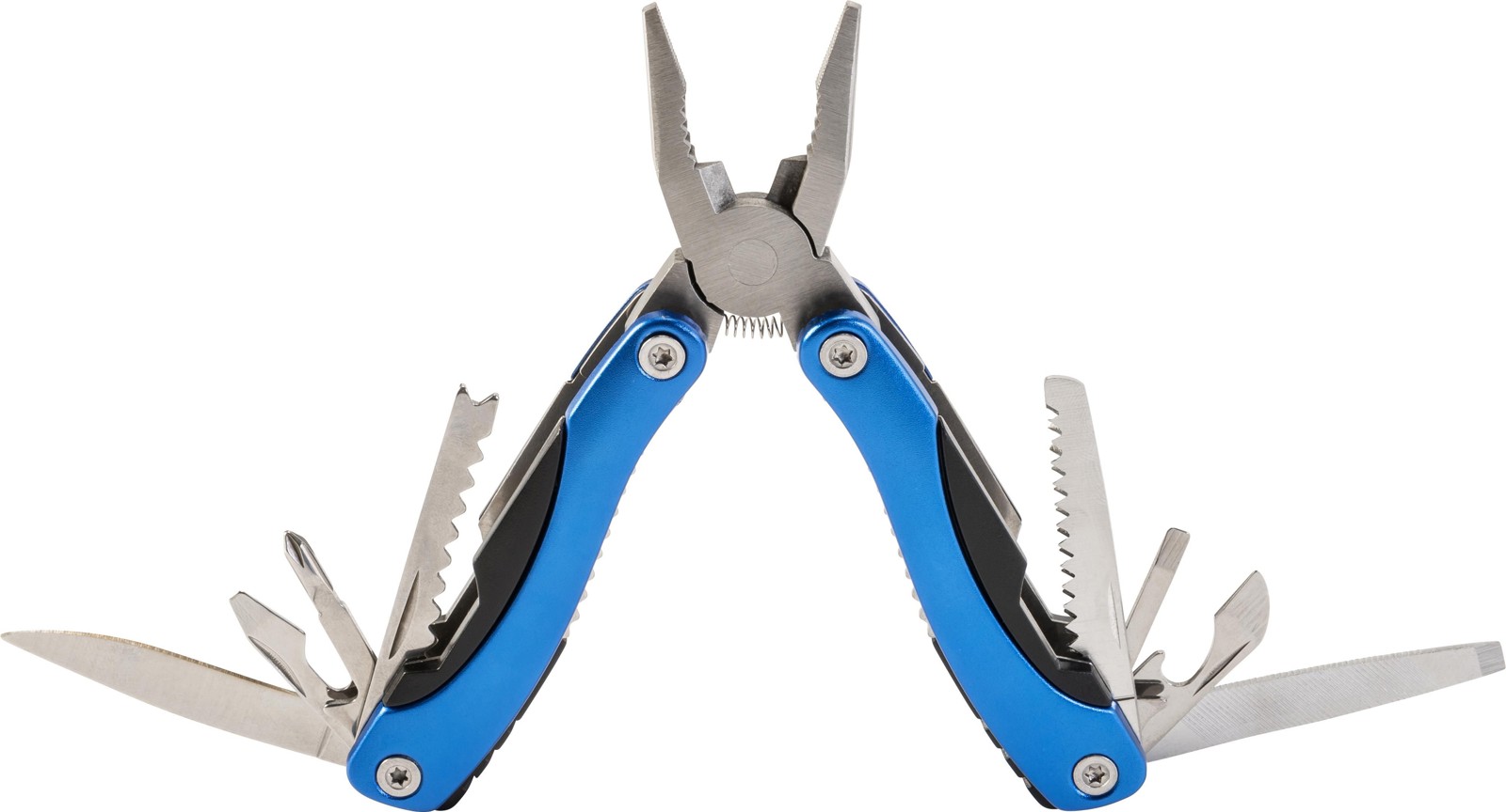 Pince multifonctions compacte en acier inoxydable avec poignée en aluminium d'aspect métallique. 9 pièces avec 13 fonctions : pinces, coupe-fil, 3 tournevis, tournevis cruciforme, lime, écailleur, couteau, fraise, ouvre bouteille et décapsuleur. Dans un étui en nylon 600D. Attention, la législation en vigueur s'applique concernant la possession et / ou le transport de couteaux ou d'outils multifonctions en public. Chaque article est fourni dans une boite individuelle en papier kraft marron.