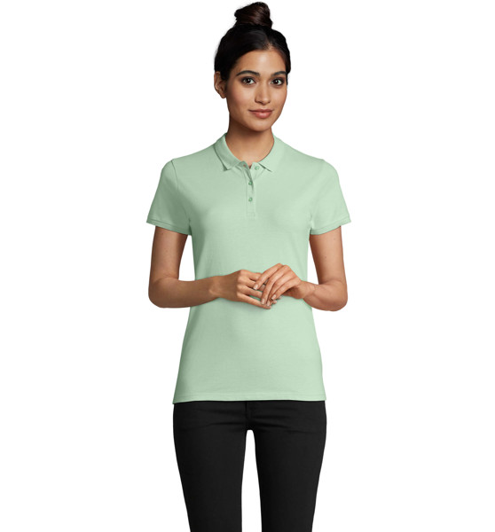 SOL'S PLANET WOMEN, polo femme, 100% coton issu de l'agriculture biologique maille piquée 170, col en côte, bande de propreté au col, patte boutonnée renforcée, manches courtes, patte 3 boutons ton sur ton, bas droit, coupé cousu, bouton de rechange sur couture intérieure côté, (1) gris chiné : 85 % coton bio chart dans la documentation produit.