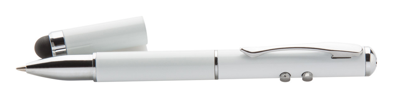 Pointeur laser multifonctionnel avec stylo bille encre bleue, stylet et lampe LED. Livré dans un étui en métal. Piles bouton fournies.