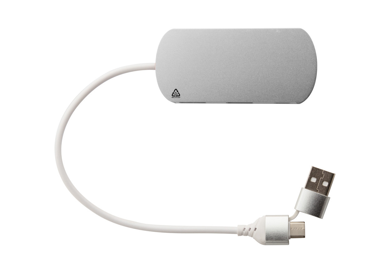 Port USB en aluminium recyclé et ABS recyclé avec 2 ports USB et 1 port USB-C, USB 2.0. Câble avec connexions USB et USB-C inclus.