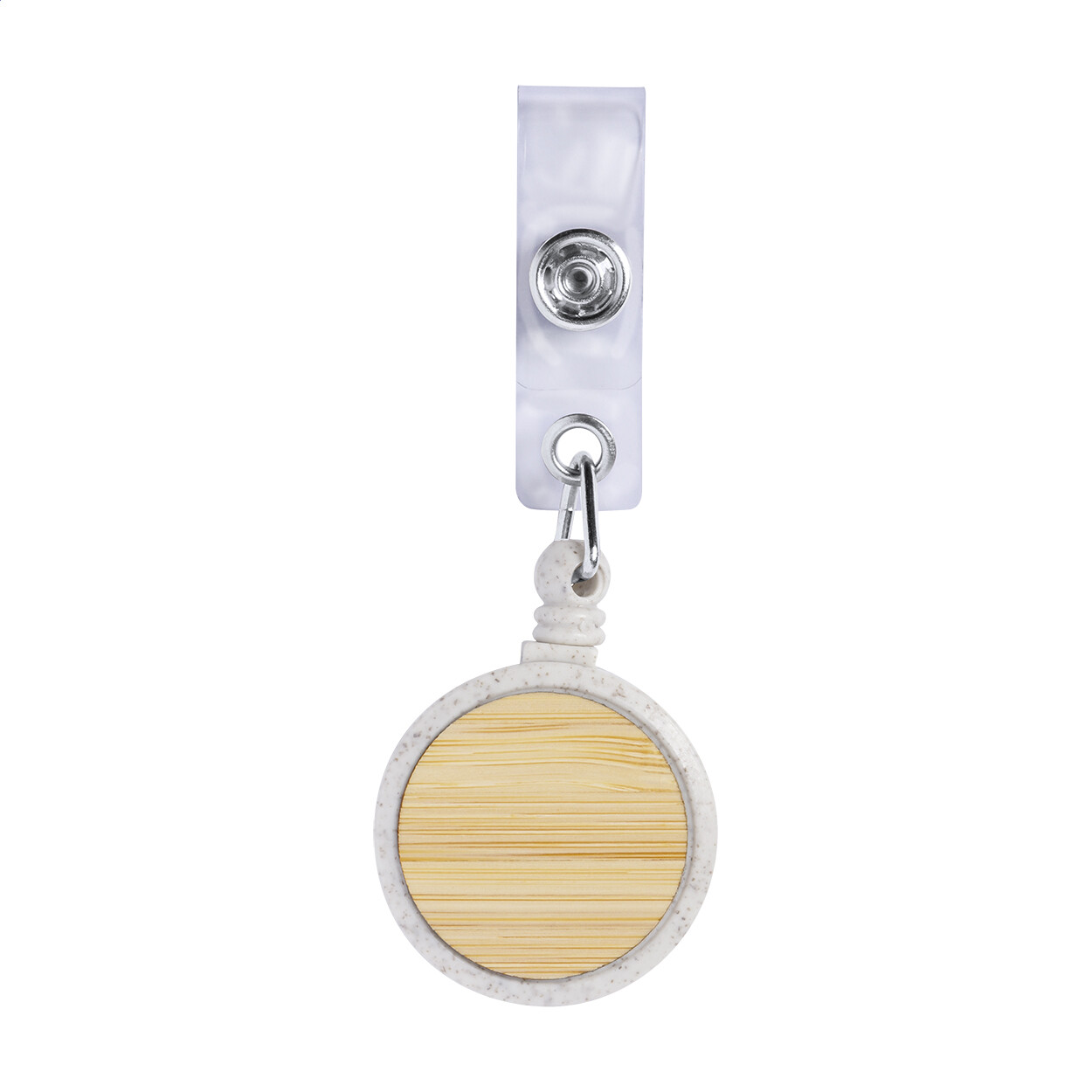 Porte-badge en plastique et bambou écologique en paille de blé avec fermeture par bouton pression, dérouleur et clip en métal.