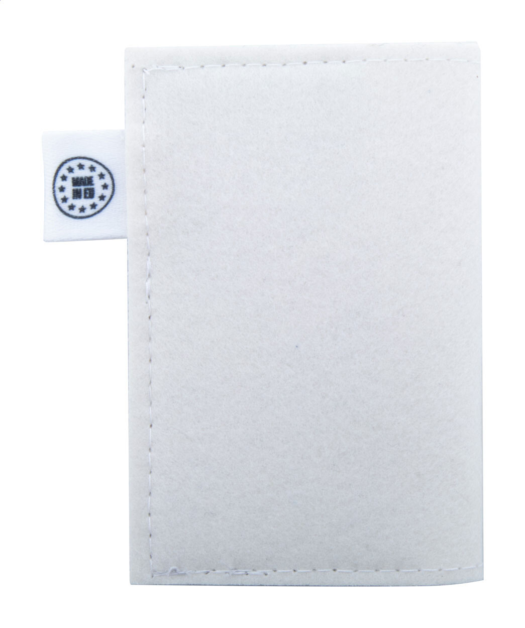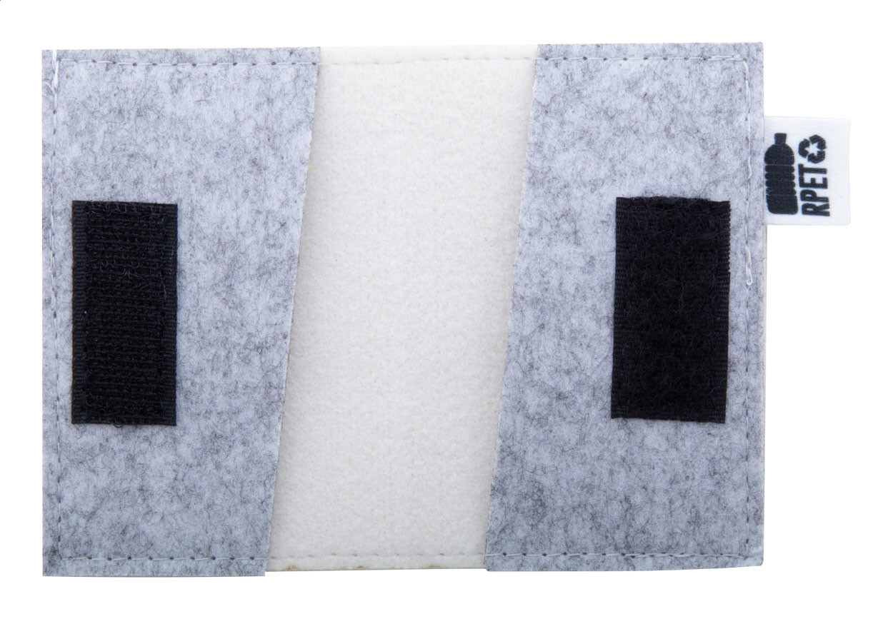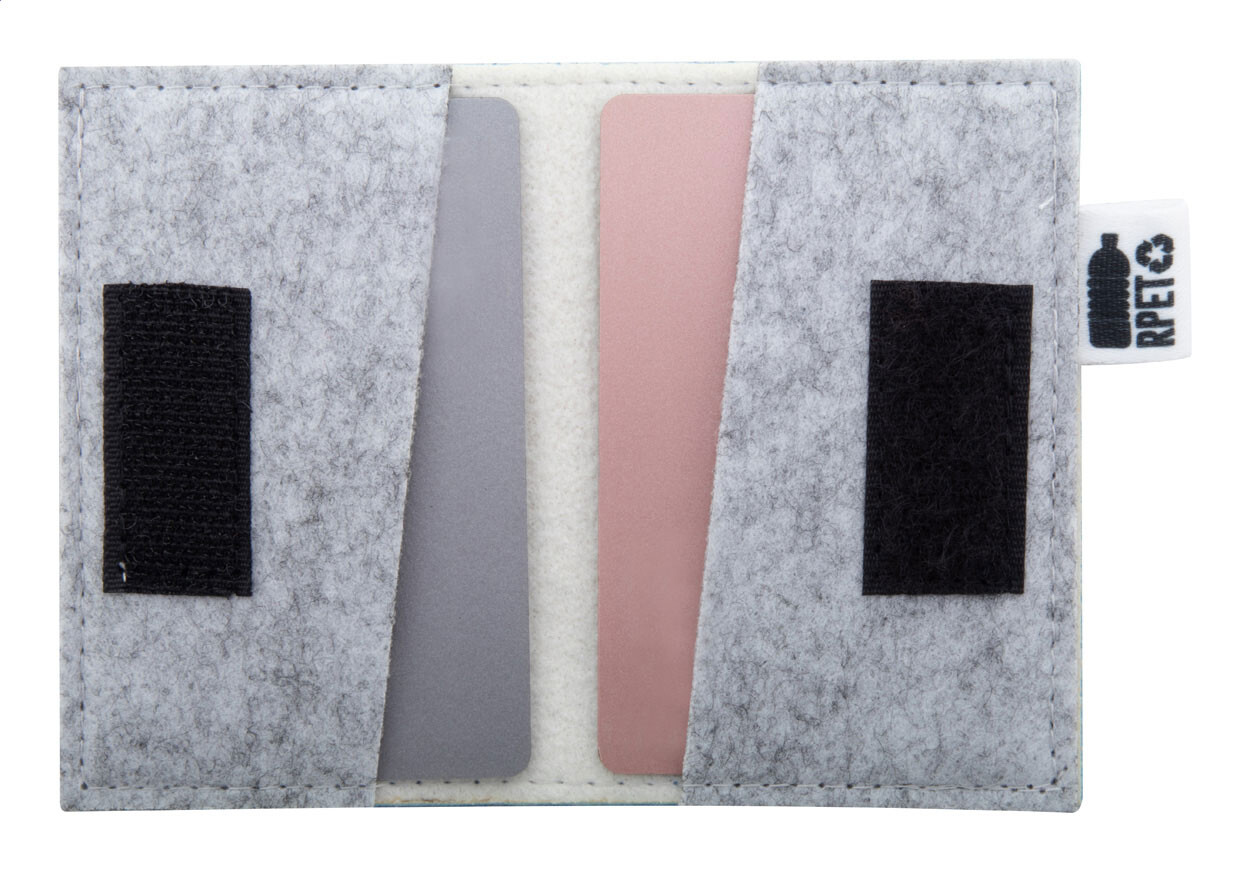 Porte-cartes de crédit en feutrine RPET sur mesure avec 2 emplacements pour cartes, fermeture velcro et couverture imprimée en quadri. Labélisé RPET. Le prix comprend l'impression en sublimation. Quantité minimale : 50 pièces.