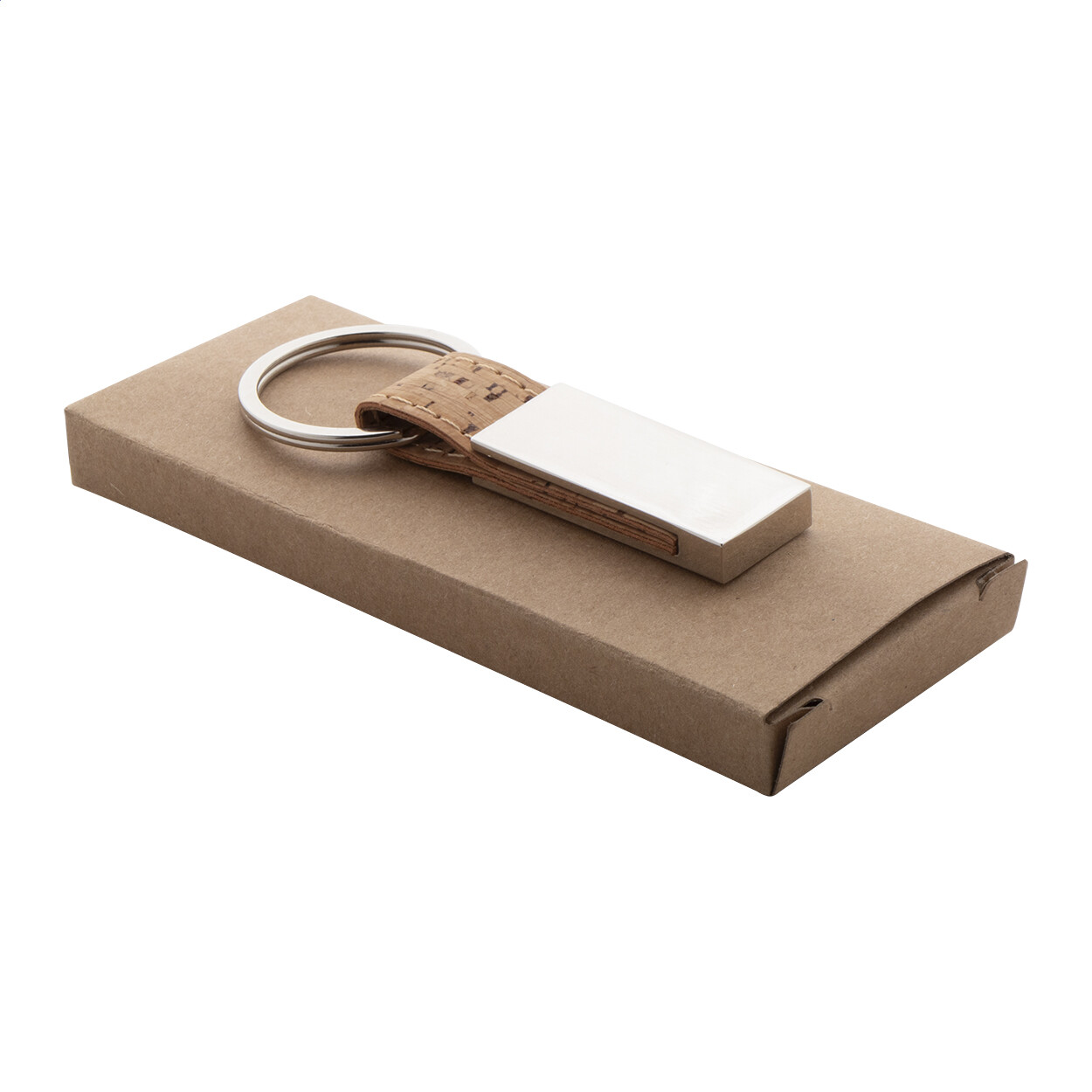 Porte-clés rectangulaire en métal et liège. Lanière en PU. Dans une boîte en papier kraft.