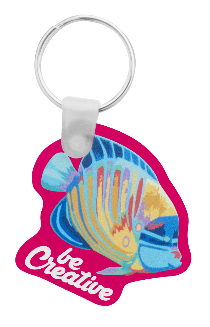 Porte-clés avec impression en quadri. Forme customisée - taille maximale : 45x45mm. Le prix comprend un marquage en UV LED sur une face. Quantité minimale : 250 pcs.