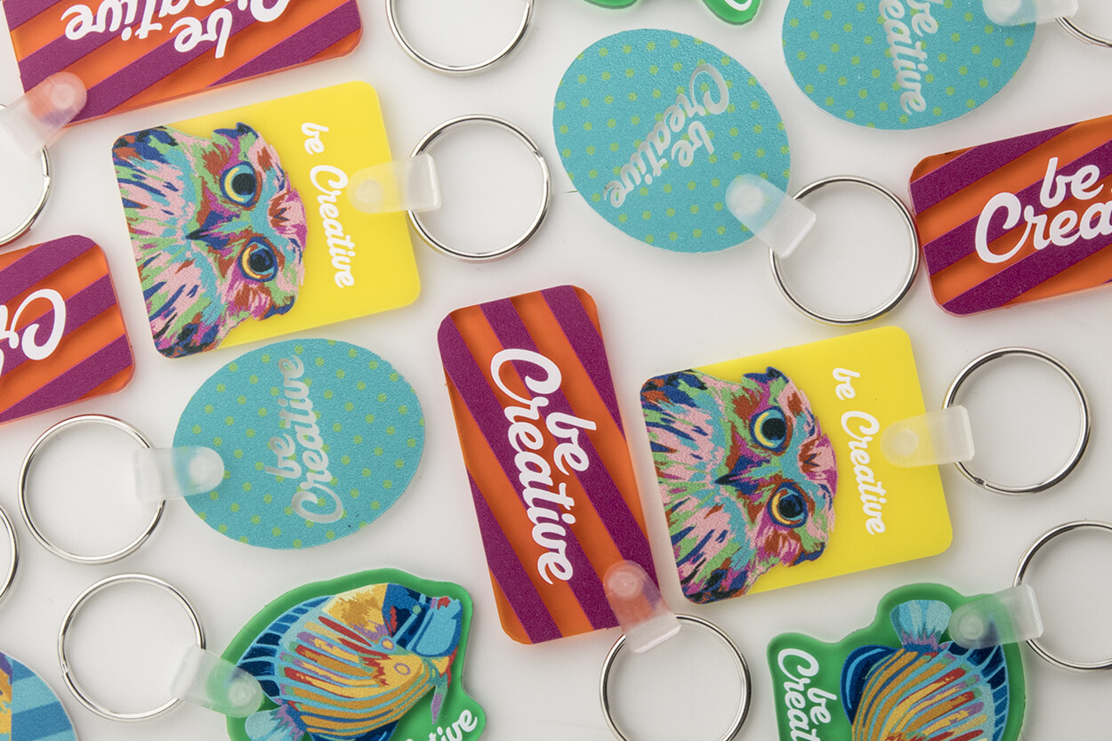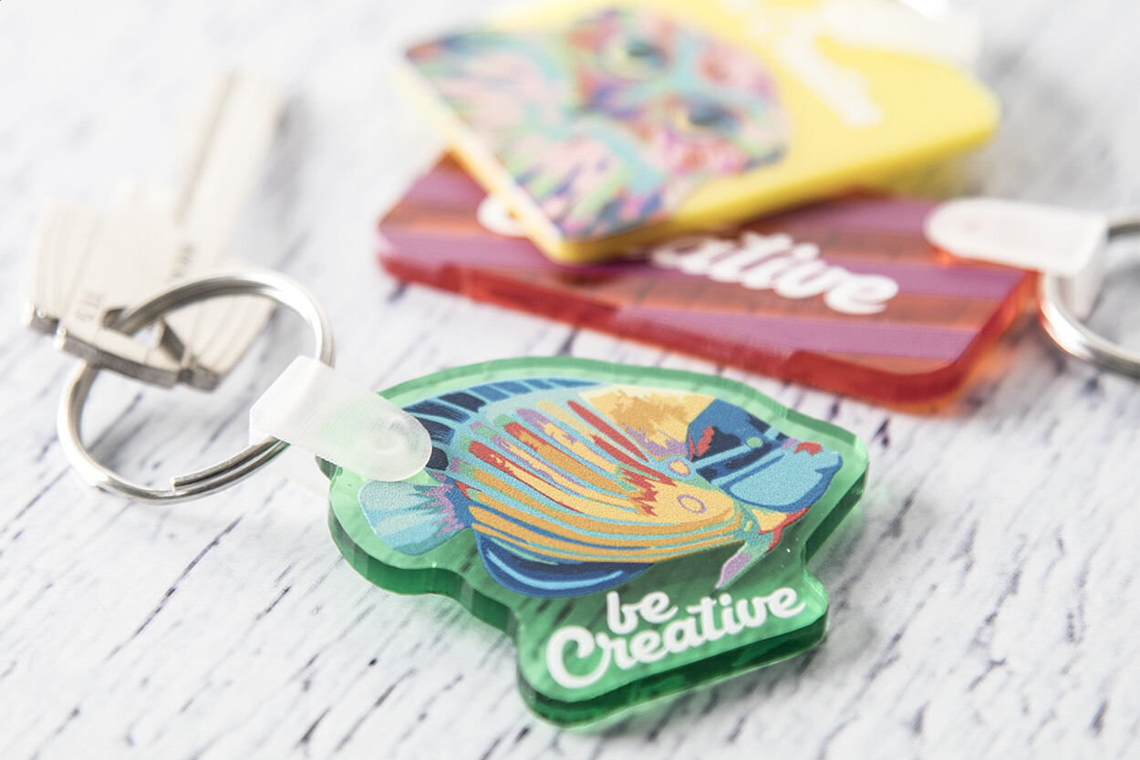 Porte-clés avec impression en quadri. Forme customisée - taille maximale : 45x45mm. Le prix comprend un marquage en UV LED sur une face. Quantité minimale : 250 pcs.