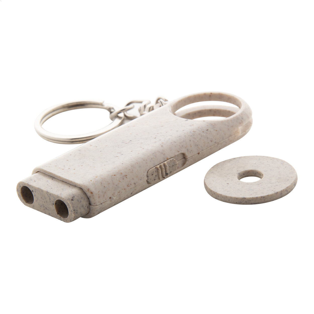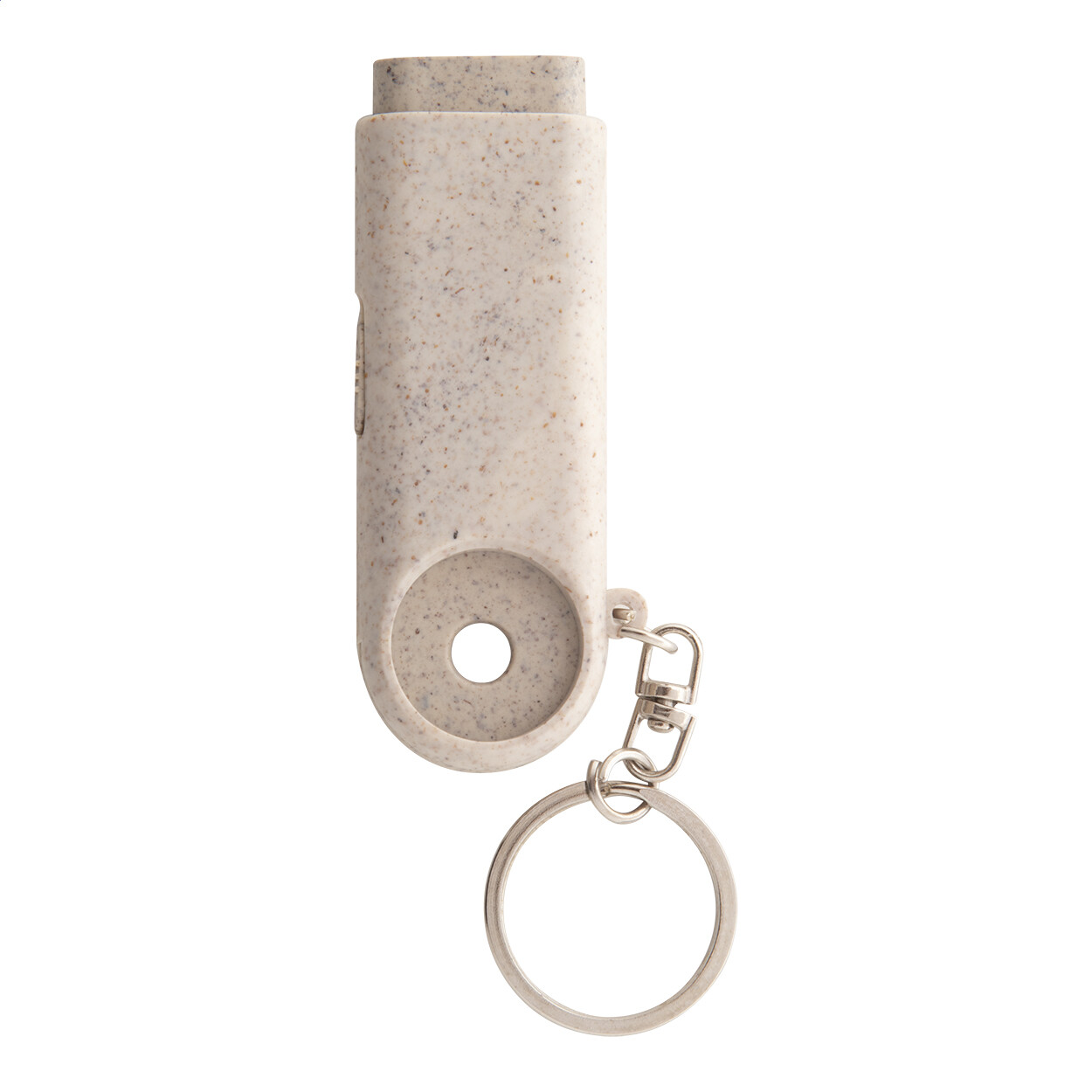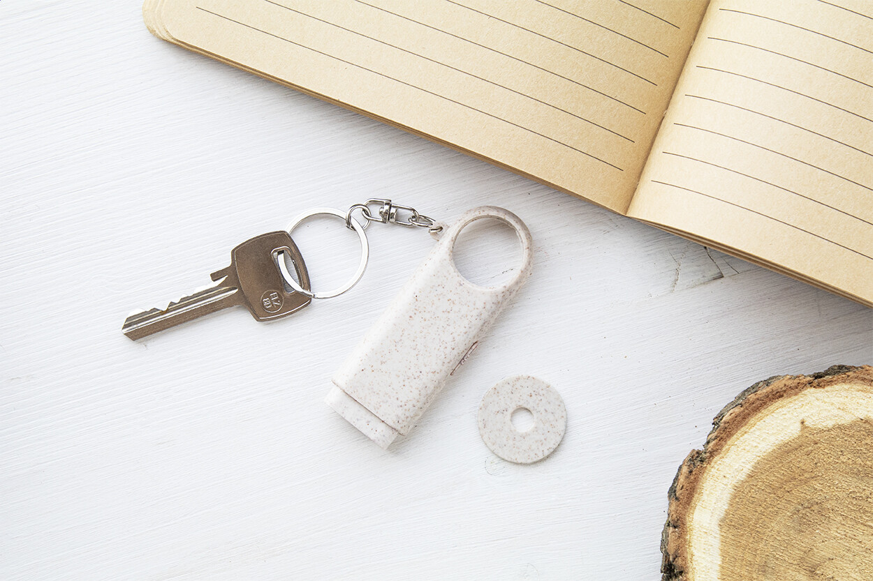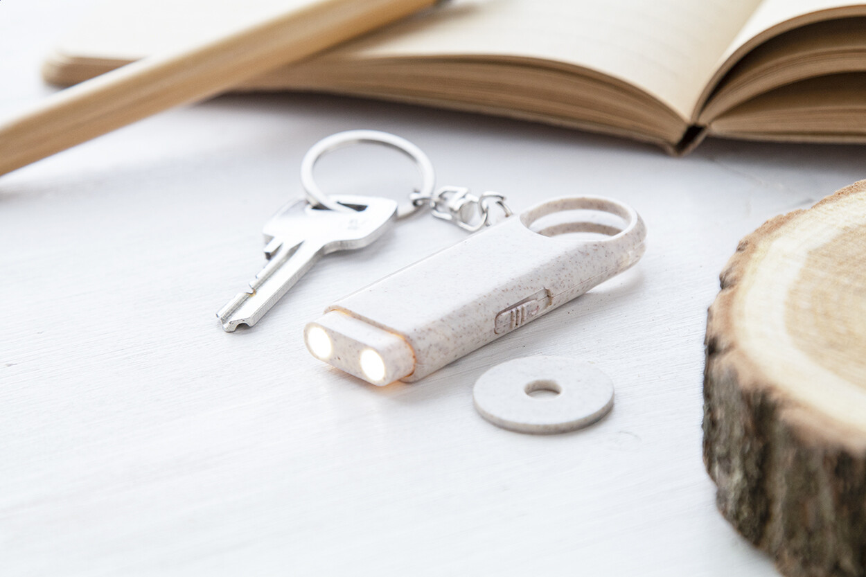 Porte-clés jeton en paille de blé écologique. 2 lampes LED. Livré avec piles bouton.